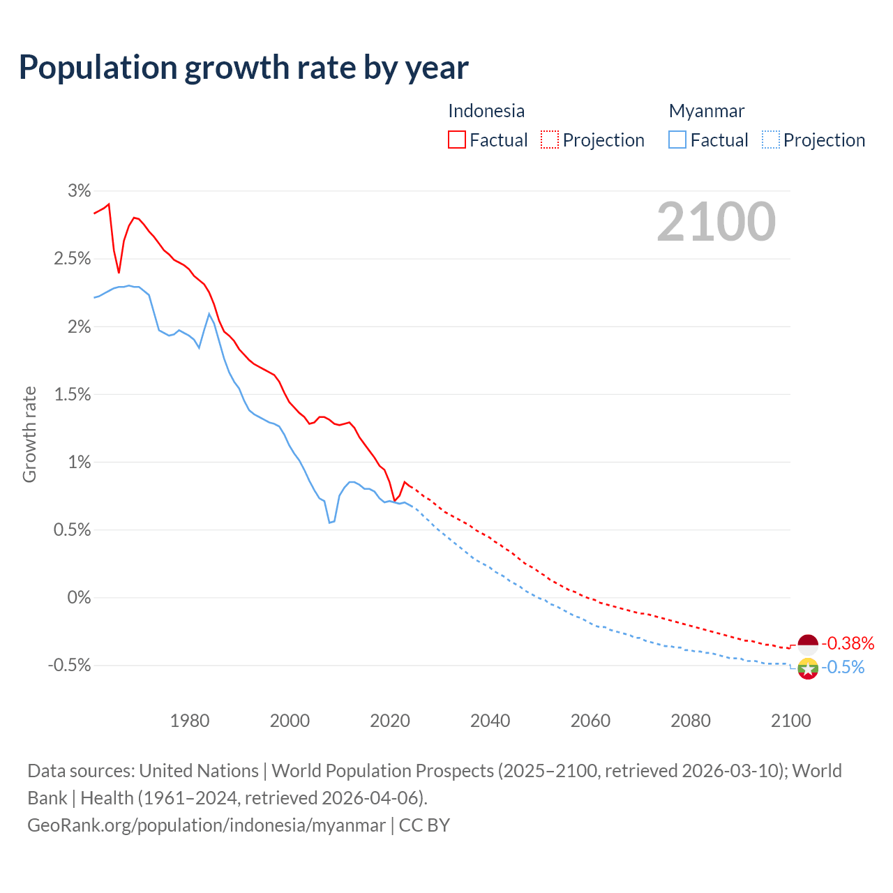 - For the last 10 years, Indonesia has had an average growth rate of +0.94% per year vs +0.74% in Myanmar.