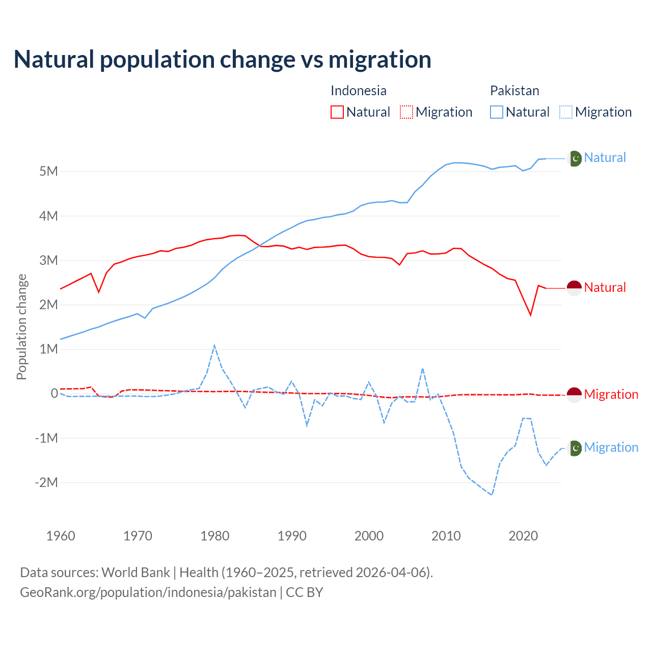 Over the last 10 years, 98.9% of the population change in Indonesia is from natural causes (a gain of 25,242,860 people) and 1.1% is from migration (a loss of 280,258 people). In Pakistan 77.8% is from natural causes (a gain of 51,255,404 people) and 22.2% is from migration (a loss of 14,629,055 people).
