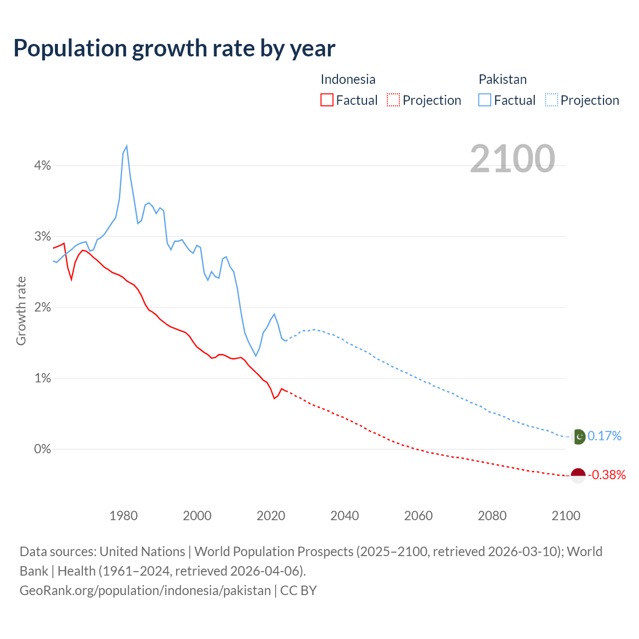 Data sources: World Bank | Health (1960–2024, retrieved 2026-04-06); United Nations | World Population Prospects (1960–2026, retrieved 2026-03-10); U.S. Census Bureau (1960–2025, retrieved 2026-02-08); Central Intelligence Agency (CIA) (2000–2019, retrieved 2026-02-20).