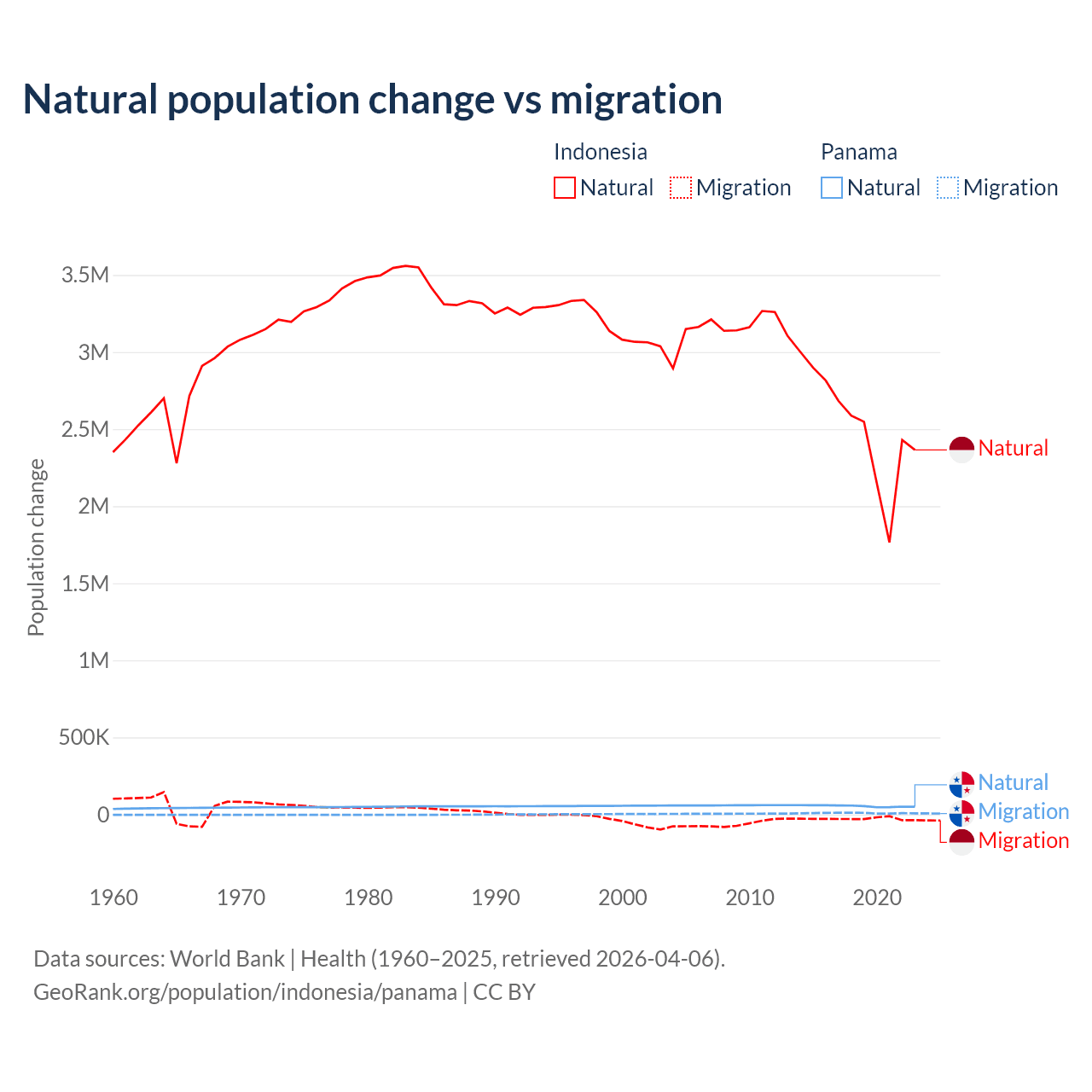 Over the last 10 years, 98.9% of the population change in Indonesia is from natural causes (a gain of 25,242,860 people) and 1.1% is from migration (a loss of 280,258 people). In Panama 86.5% is from natural causes (a gain of 544,211 people) and 13.5% is from migration (a gain of 84,849 people).