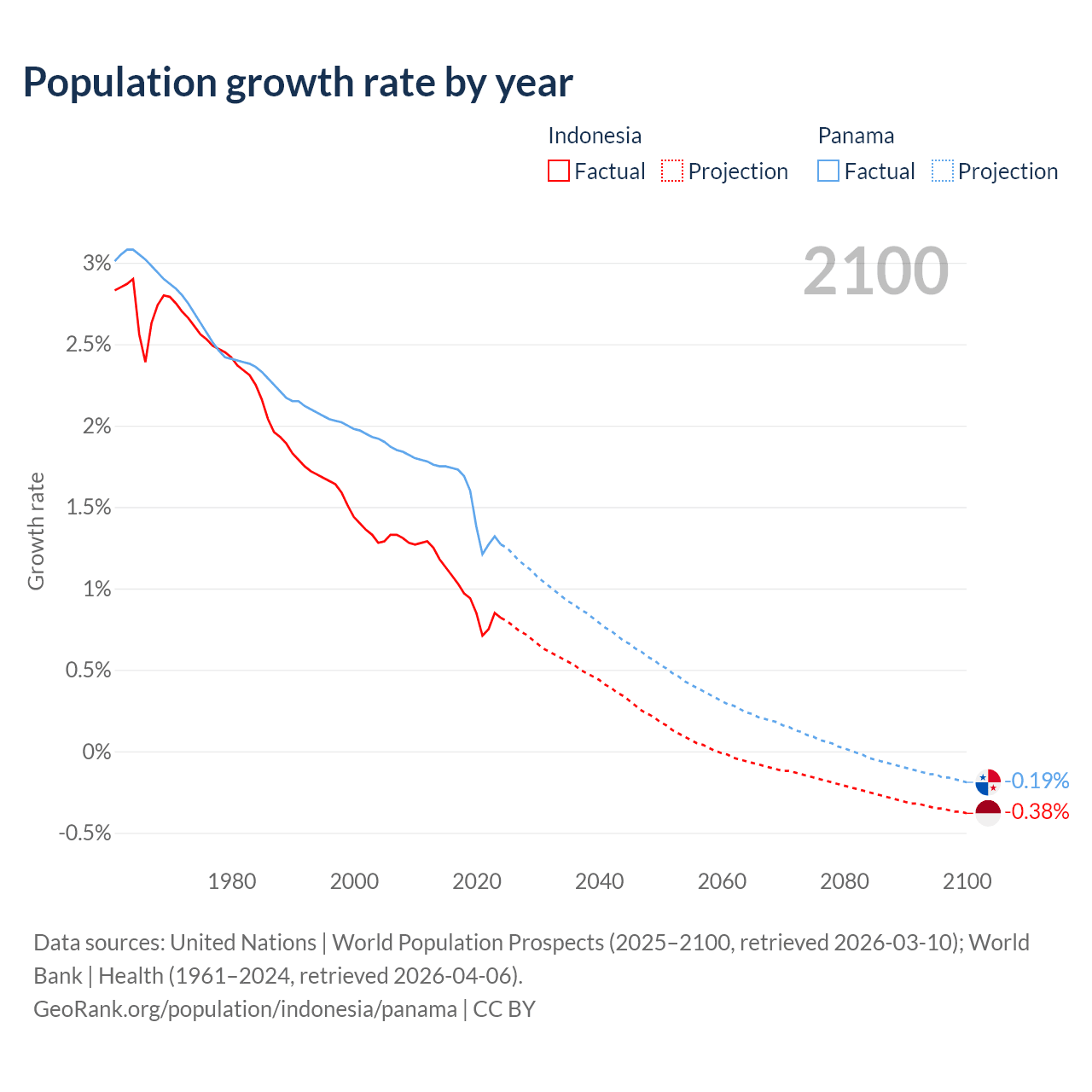 - For the last 10 years, Indonesia has had an average growth rate of +0.94% per year vs +1.52% in Panama.