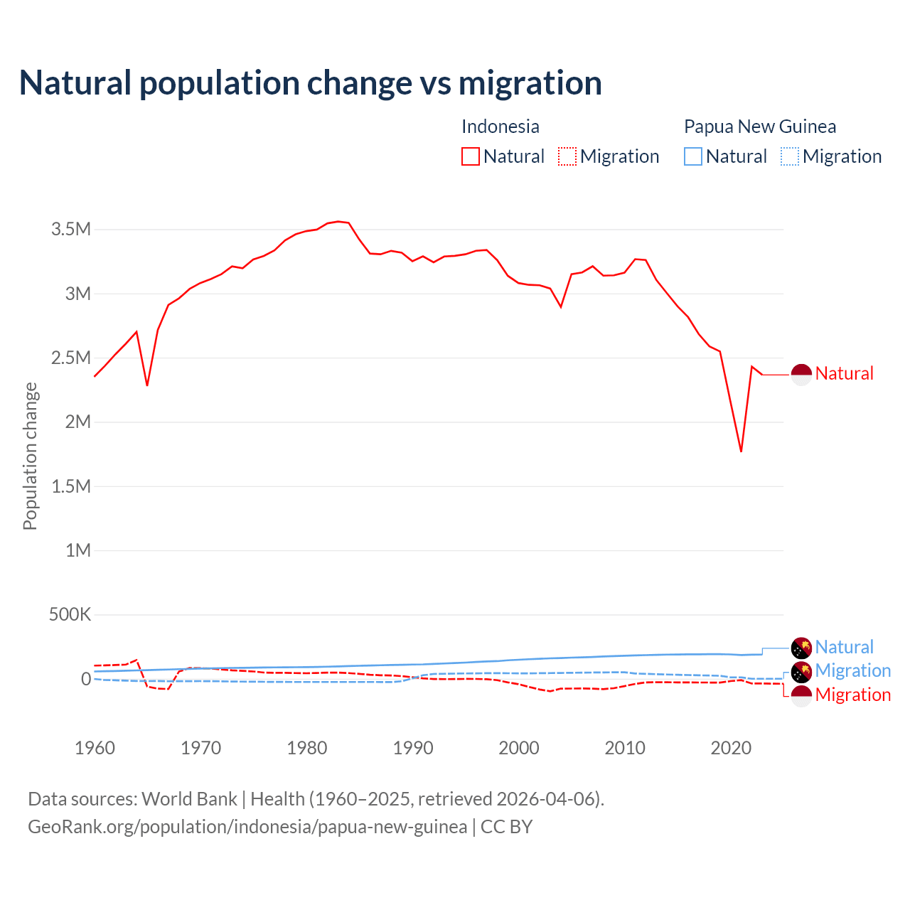 Over the last 10 years, 98.9% of the population change in Indonesia is from natural causes (a gain of 25,242,860 people) and 1.1% is from migration (a loss of 280,258 people). In Papua New Guinea 91% is from natural causes (a gain of 1,883,906 people) and 8.98% is from migration (a gain of 185,900 people).