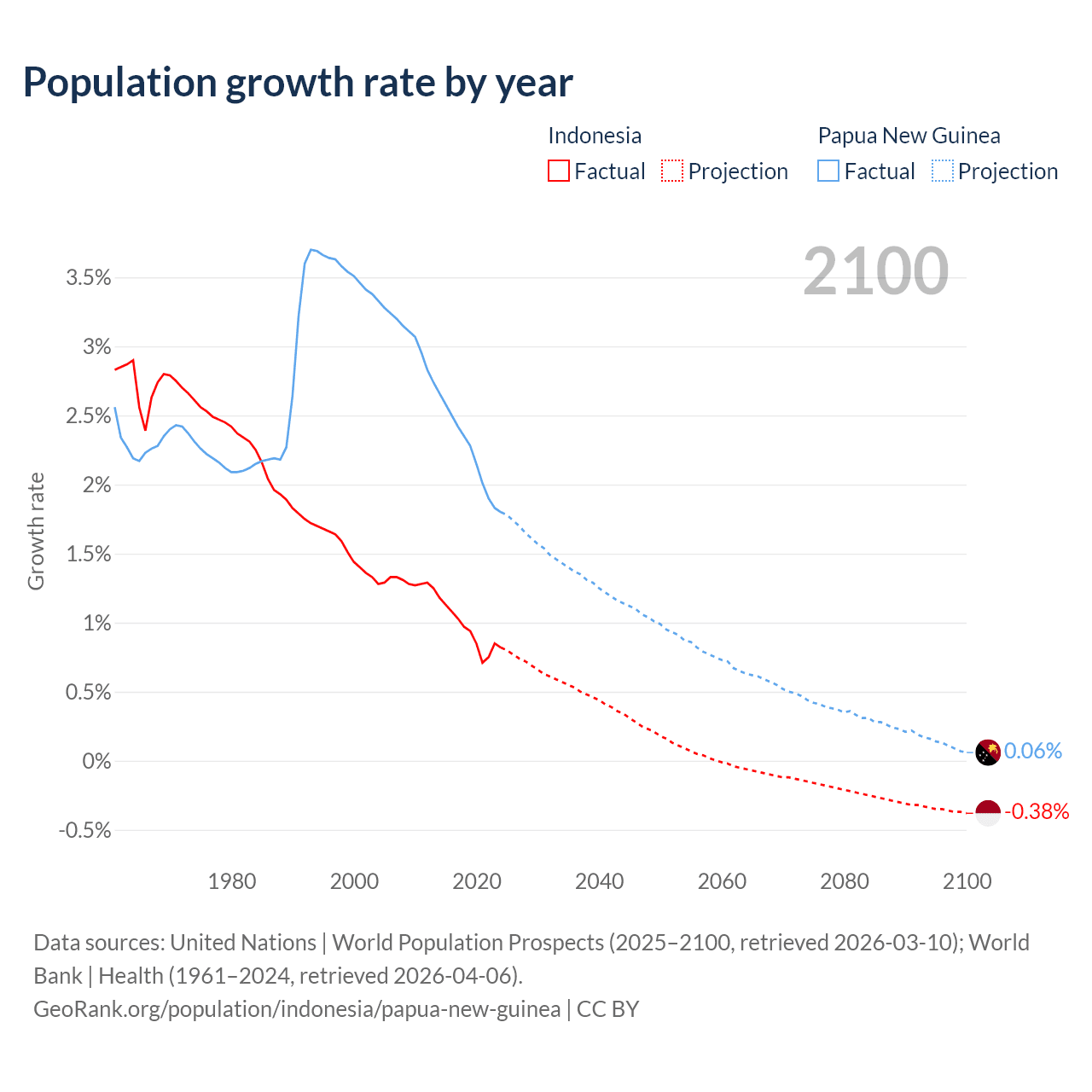 - For the last 10 years, Indonesia has had an average growth rate of +0.94% per year vs +2.23% in Papua New Guinea.