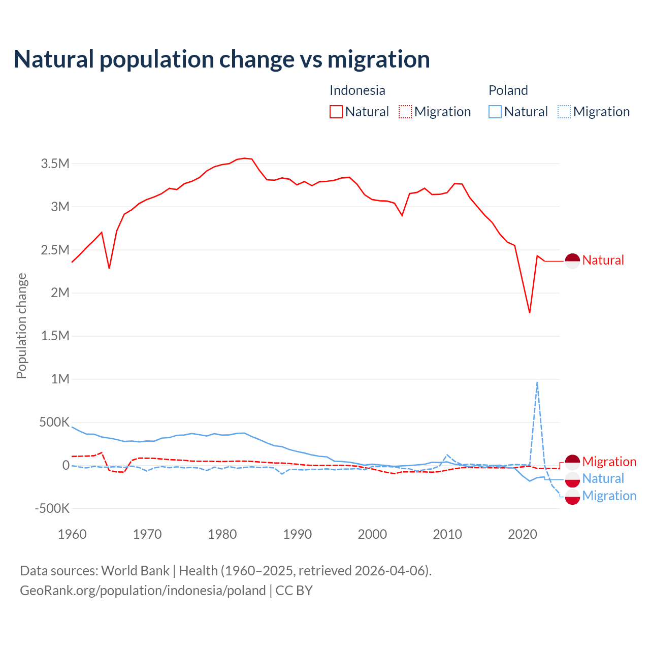 Over the last 10 years, 98.9% of the population change in Indonesia is from natural causes (a gain of 25,242,860 people) and 1.1% is from migration (a loss of 280,258 people). In Poland 41.4% is from natural causes (a loss of 675,443 people) and 58.6% is from migration (a gain of 955,766 people).