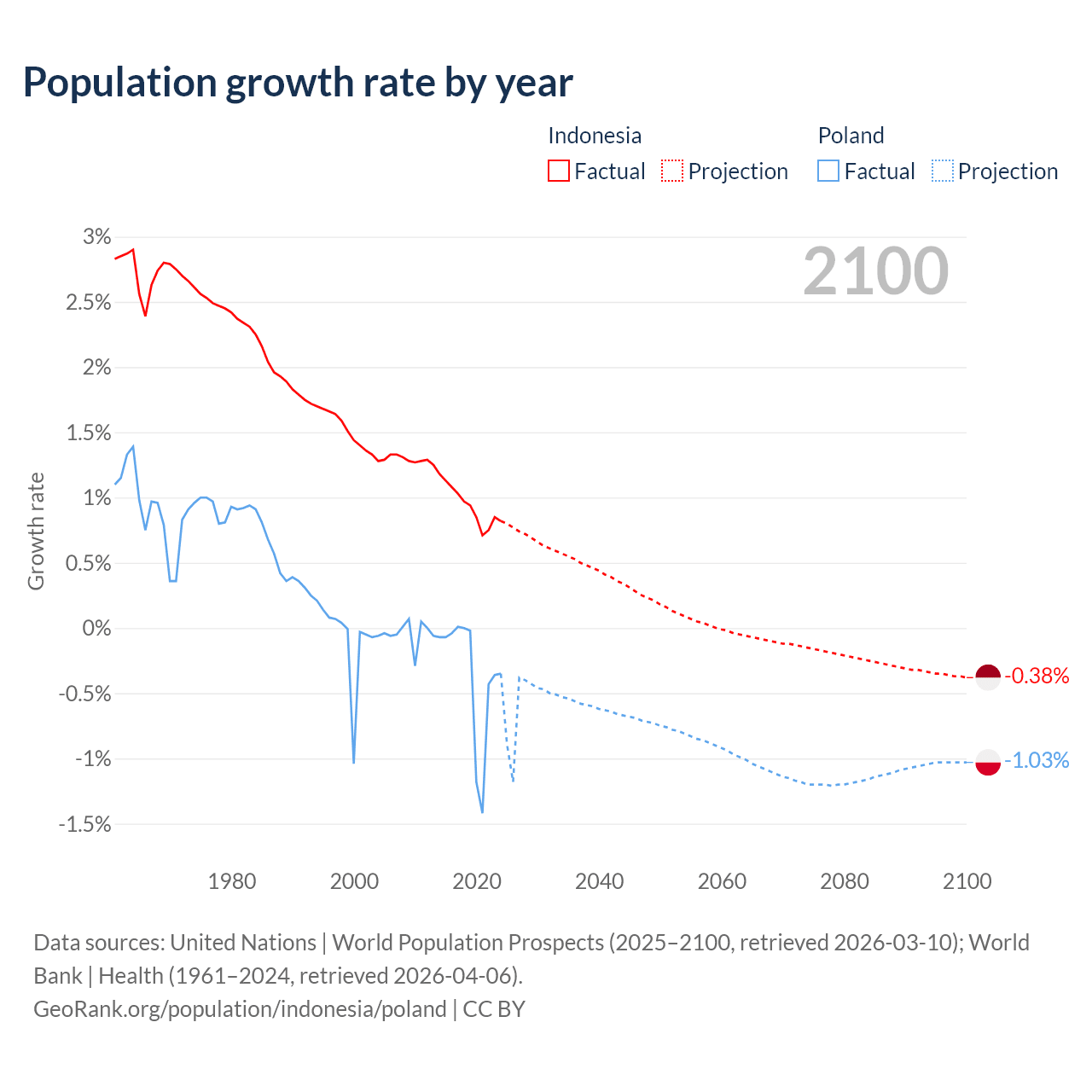 - For the last 10 years, Indonesia has had an average growth rate of +0.94% per year vs -0.36% in Poland.