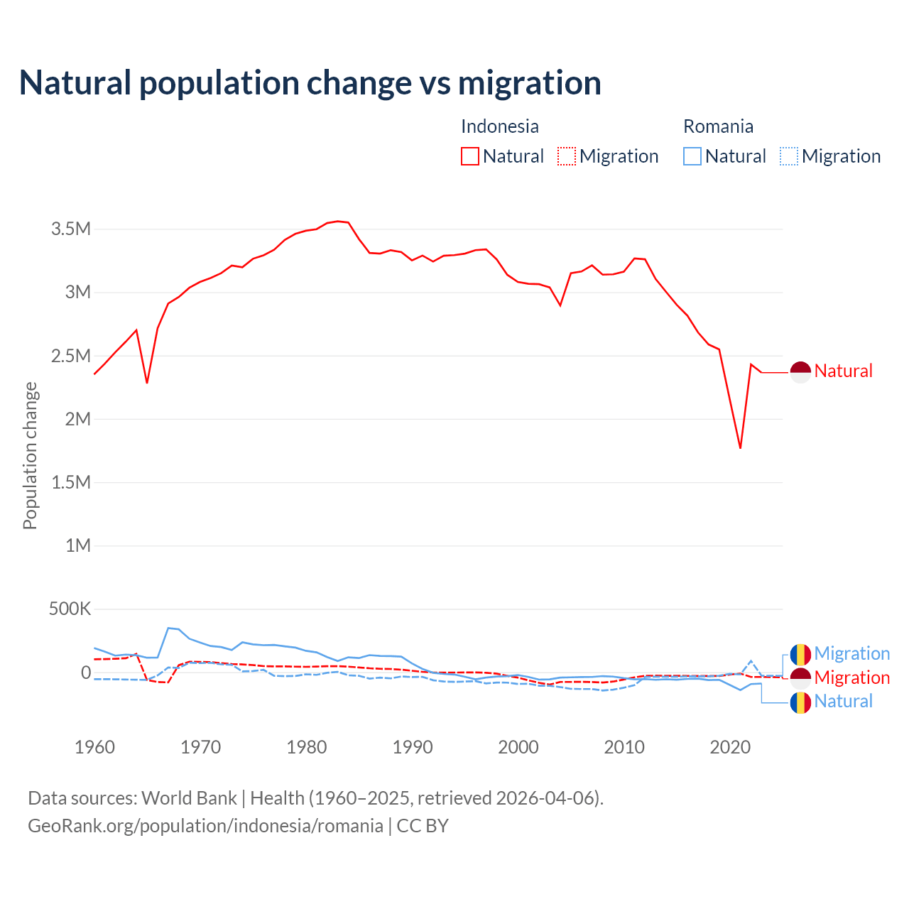Over the last 10 years, 98.9% of the population change in Indonesia is from natural causes (a gain of 25,242,860 people) and 1.1% is from migration (a loss of 280,258 people). In Romania 82% is from natural causes (a loss of 766,295 people) and 18% is from migration (a loss of 167,917 people).