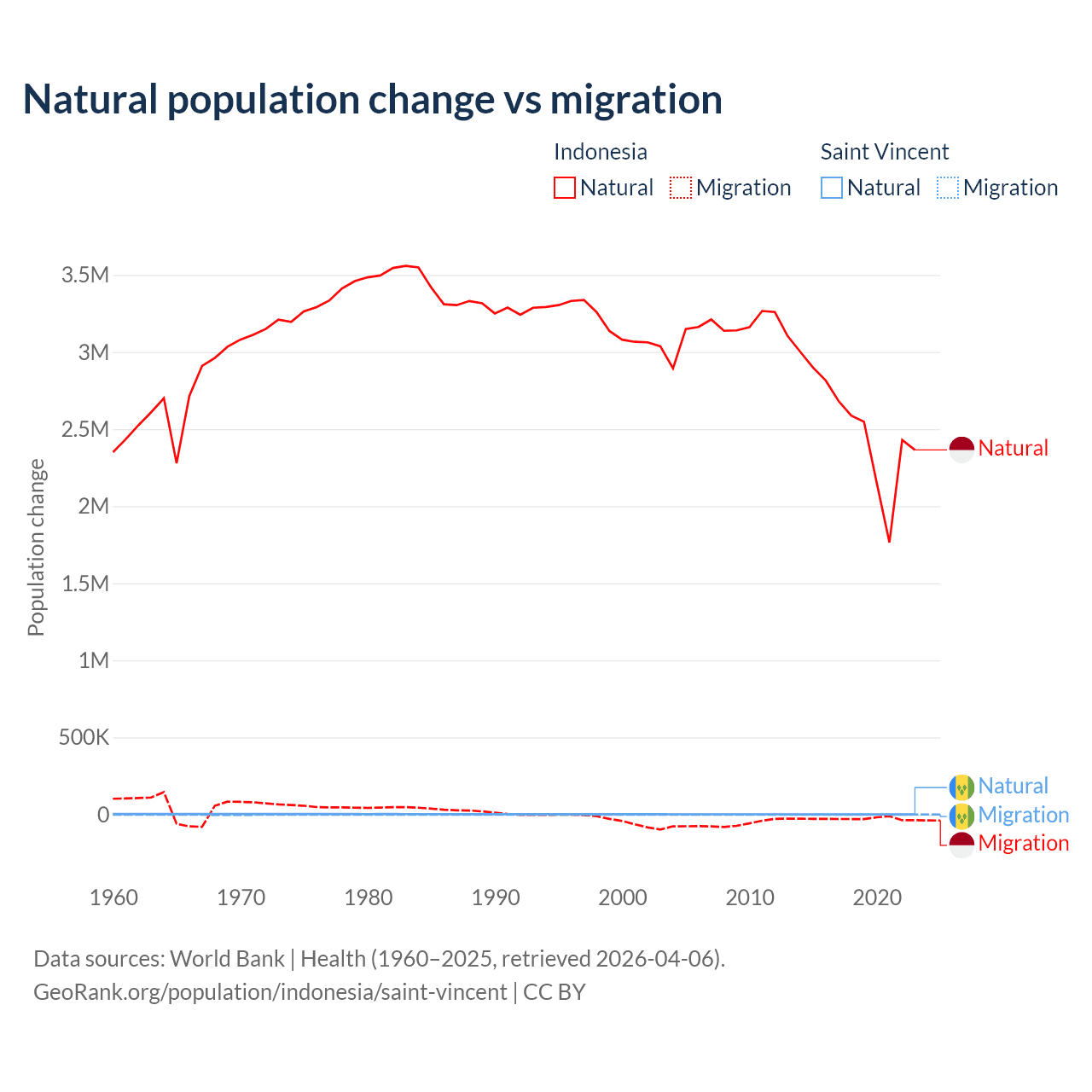 Over the last 10 years, 98.9% of the population change in Indonesia is from natural causes (a gain of 25,242,860 people) and 1.1% is from migration (a loss of 280,258 people). In Saint Vincent 21.2% is from natural causes (a gain of 2,525 people) and 78.8% is from migration (a loss of 9,393 people).