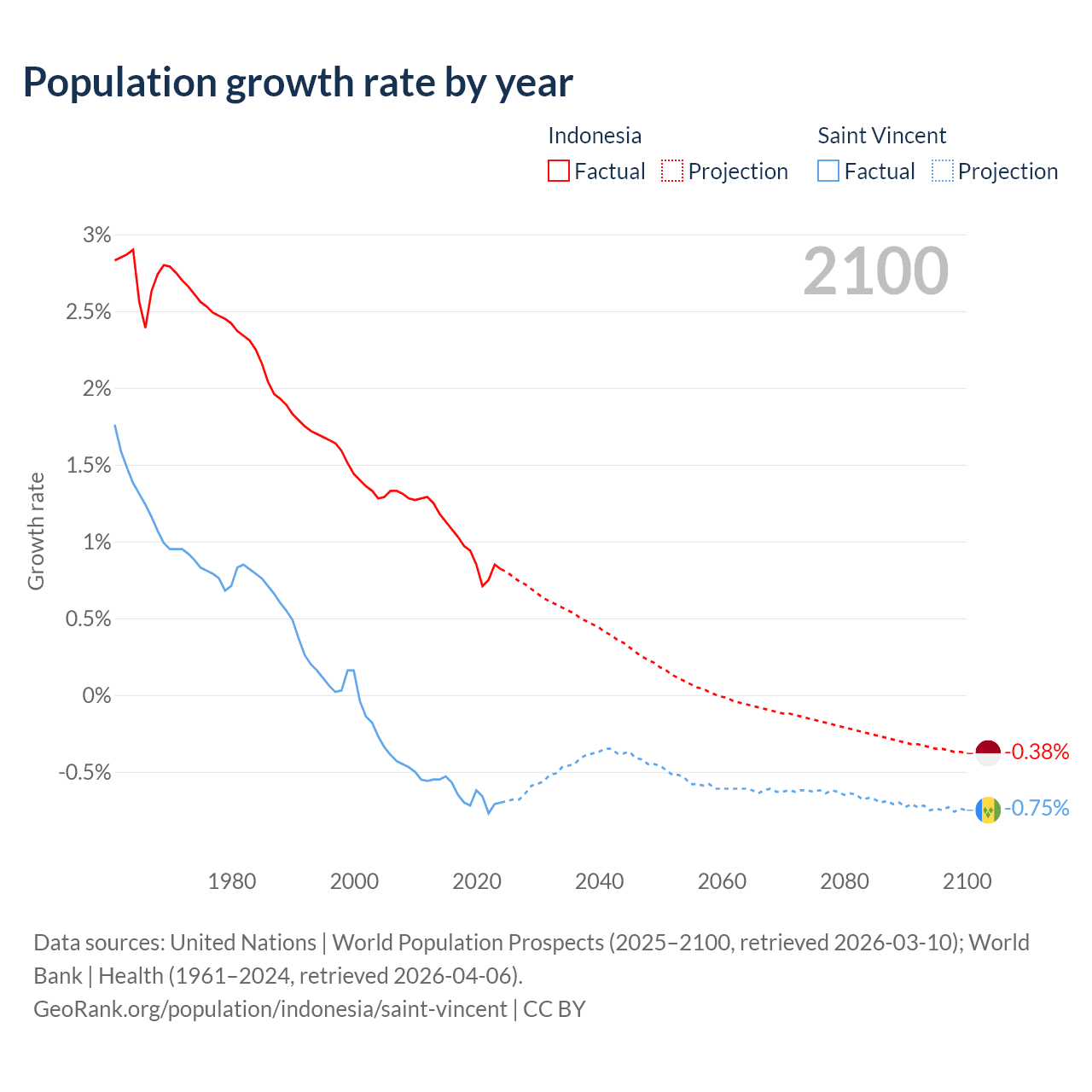 - For the last 10 years, Indonesia has had an average growth rate of +0.94% per year vs -0.65% in Saint Vincent.