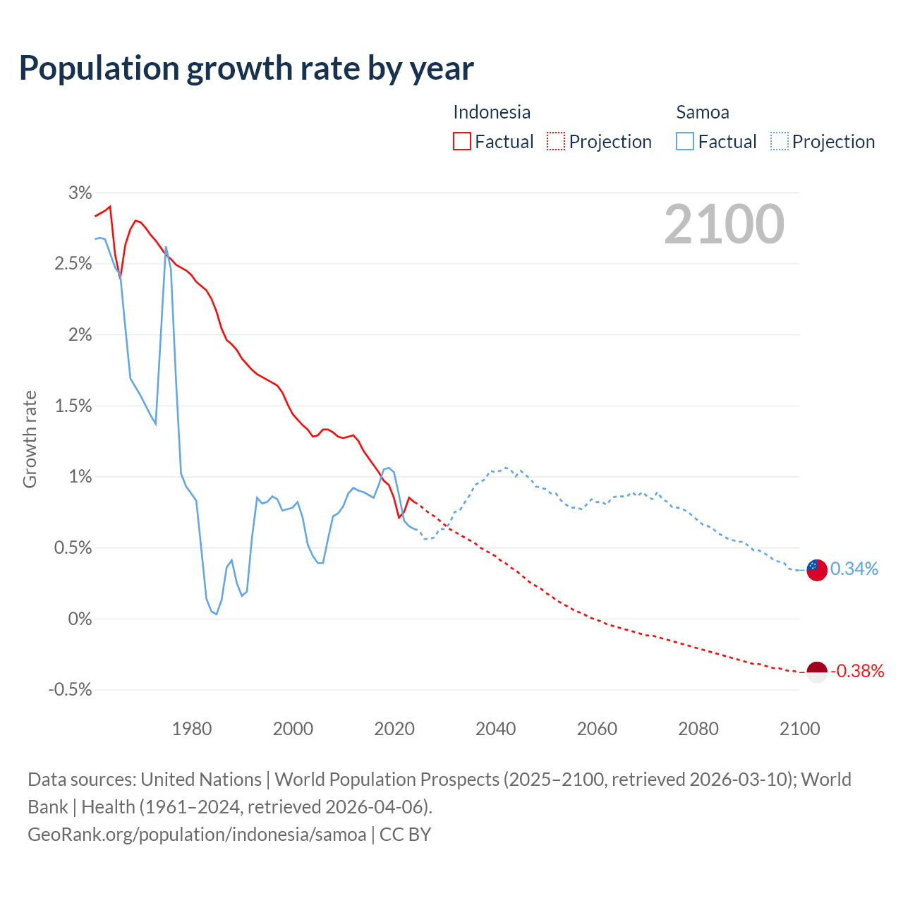 - For the last 10 years, Indonesia has had an average growth rate of +0.94% per year vs +0.87% in Samoa.