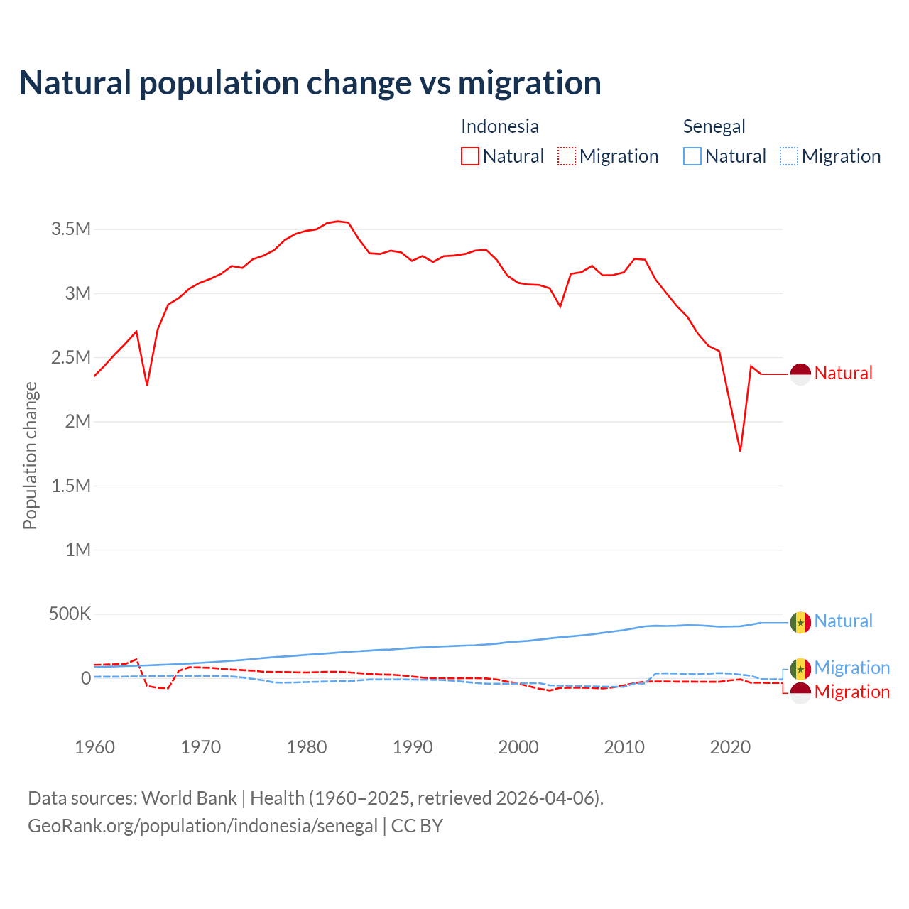 Over the last 10 years, 98.9% of the population change in Indonesia is from natural causes (a gain of 25,242,860 people) and 1.1% is from migration (a loss of 280,258 people). In Senegal 93.9% is from natural causes (a gain of 4,089,205 people) and 6.13% is from migration (a gain of 267,266 people).