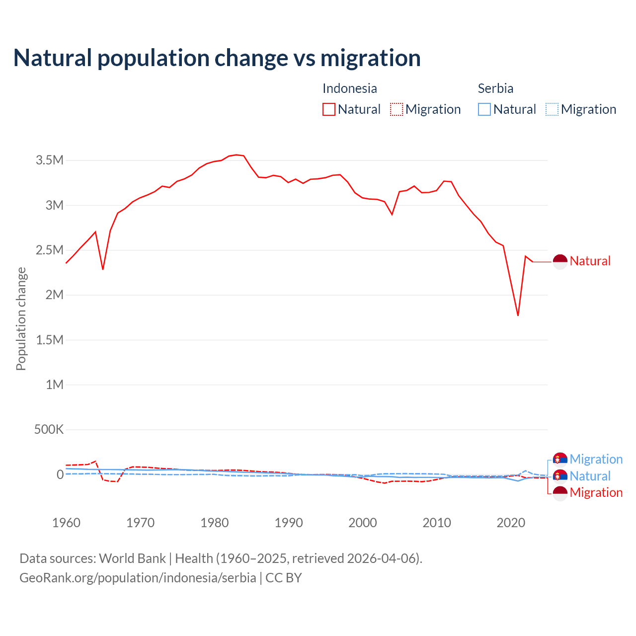 Over the last 10 years, 98.9% of the population change in Indonesia is from natural causes (a gain of 25,242,860 people) and 1.1% is from migration (a loss of 280,258 people). In Serbia 83.3% is from natural causes (a loss of 435,148 people) and 16.7% is from migration (a loss of 87,110 people).