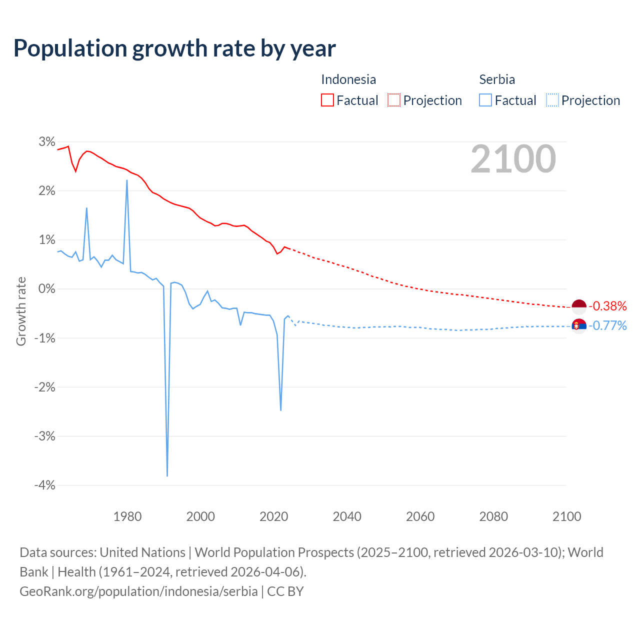 - For the last 10 years, Indonesia has had an average growth rate of +0.94% per year vs -0.76% in Serbia.