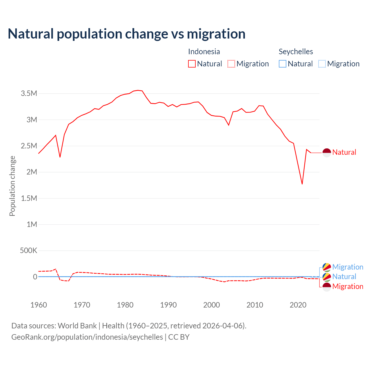 Over the last 10 years, 98.9% of the population change in Indonesia is from natural causes (a gain of 25,242,860 people) and 1.1% is from migration (a loss of 280,258 people). In the Seychelles 31.4% is from natural causes (a gain of 8,122 people) and 68.6% is from migration (a gain of 17,748 people).
