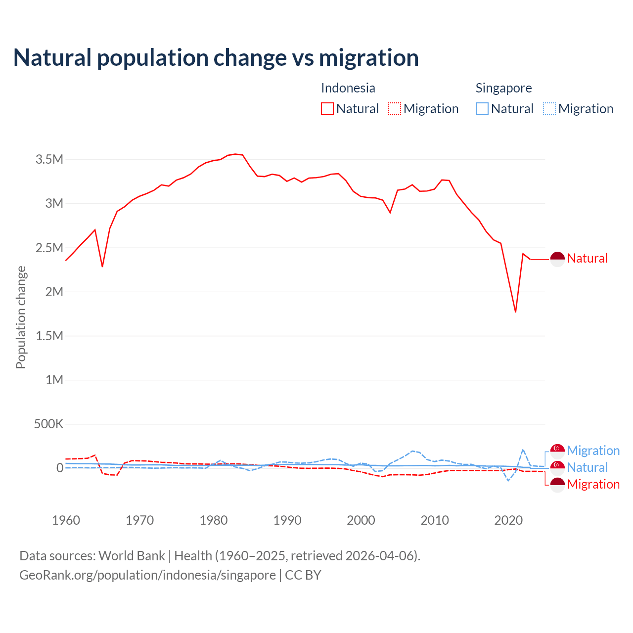 Over the last 10 years, 98.9% of the population change in Indonesia is from natural causes (a gain of 25,242,860 people) and 1.1% is from migration (a loss of 280,258 people). In Singapore 54.8% is from natural causes (a gain of 195,953 people) and 45.2% is from migration (a gain of 161,805 people).