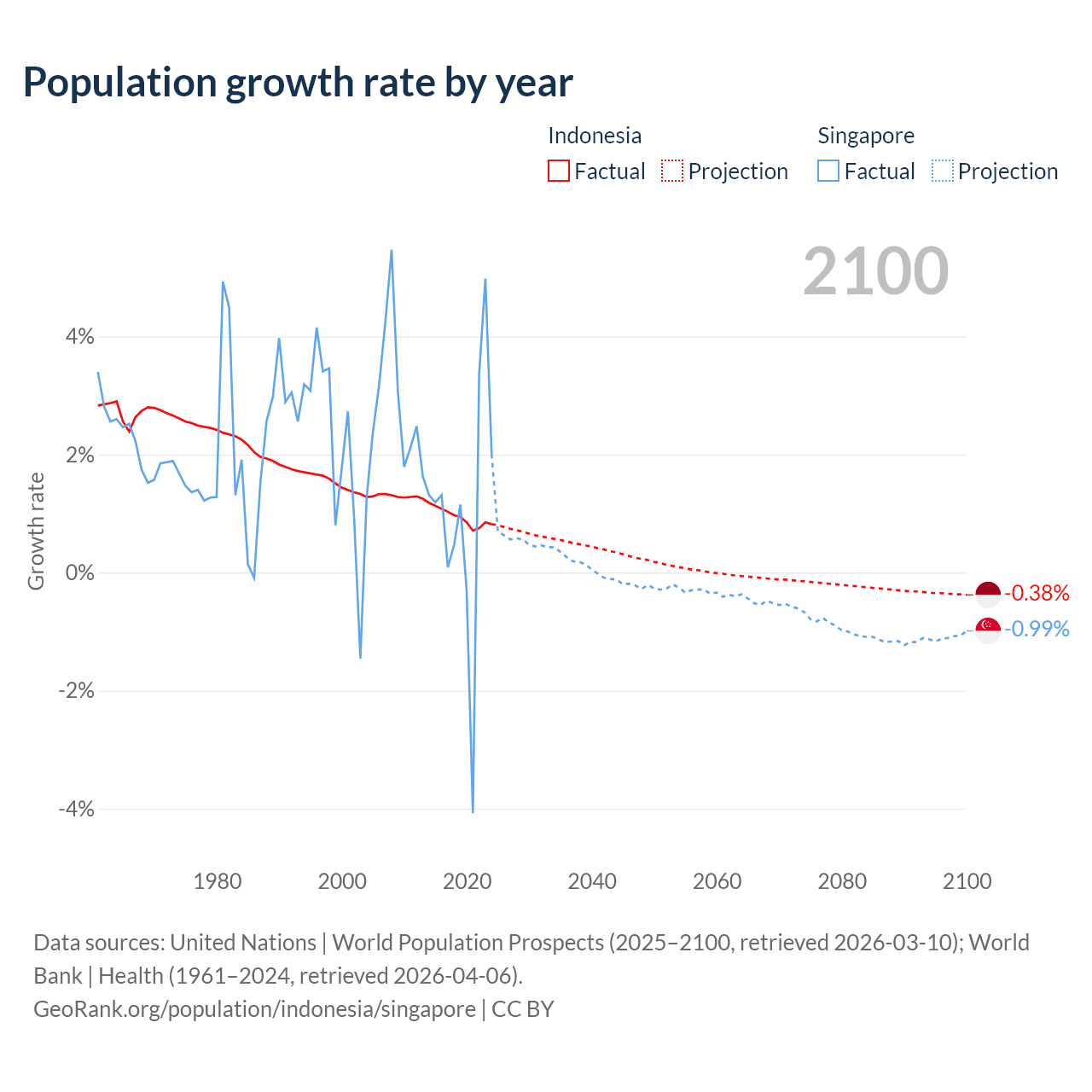 - For the last 10 years, Indonesia has had an average growth rate of +0.94% per year vs +1.04% in Singapore.