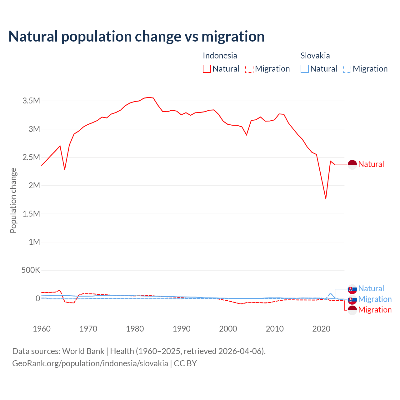 Over the last 10 years, 98.9% of the population change in Indonesia is from natural causes (a gain of 25,242,860 people) and 1.1% is from migration (a loss of 280,258 people). In Slovakia 7.47% is from natural causes (a loss of 8,728 people) and 92.5% is from migration (a gain of 108,156 people).
