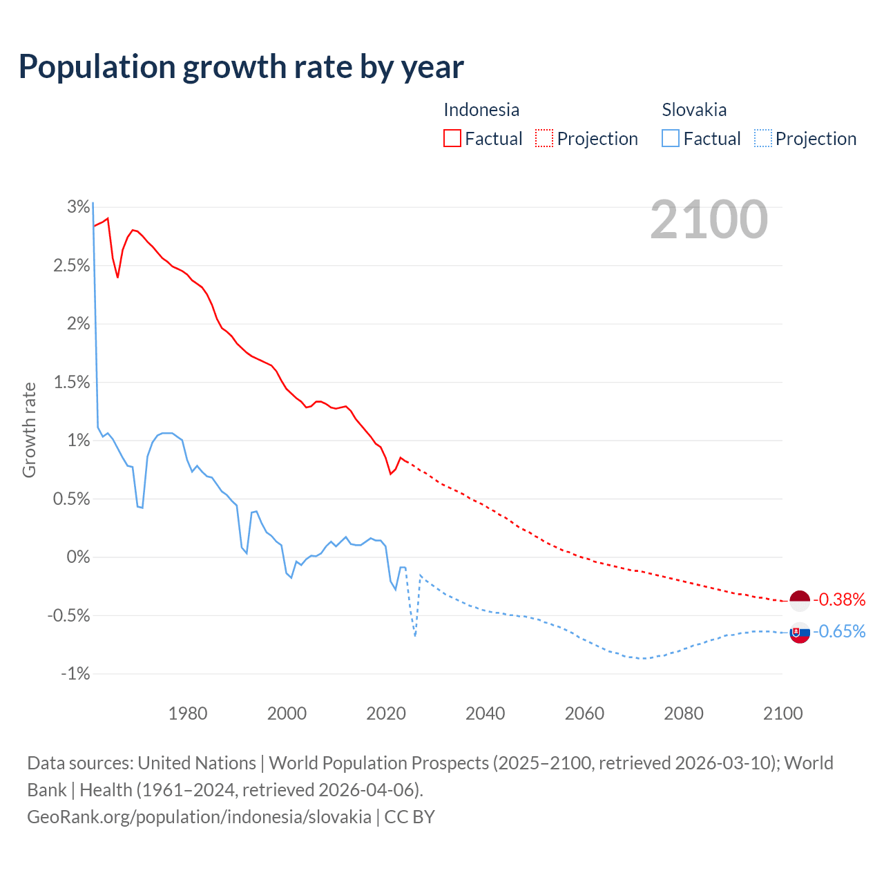 - For the last 10 years, Indonesia has had an average growth rate of +0.94% per year vs +0.01% in Slovakia.