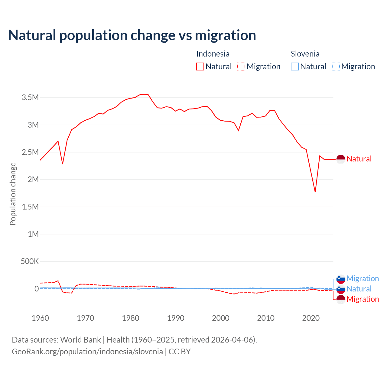 Over the last 10 years, 98.9% of the population change in Indonesia is from natural causes (a gain of 25,242,860 people) and 1.1% is from migration (a loss of 280,258 people). In Slovenia 18.1% is from natural causes (a loss of 17,573 people) and 81.9% is from migration (a gain of 79,532 people).