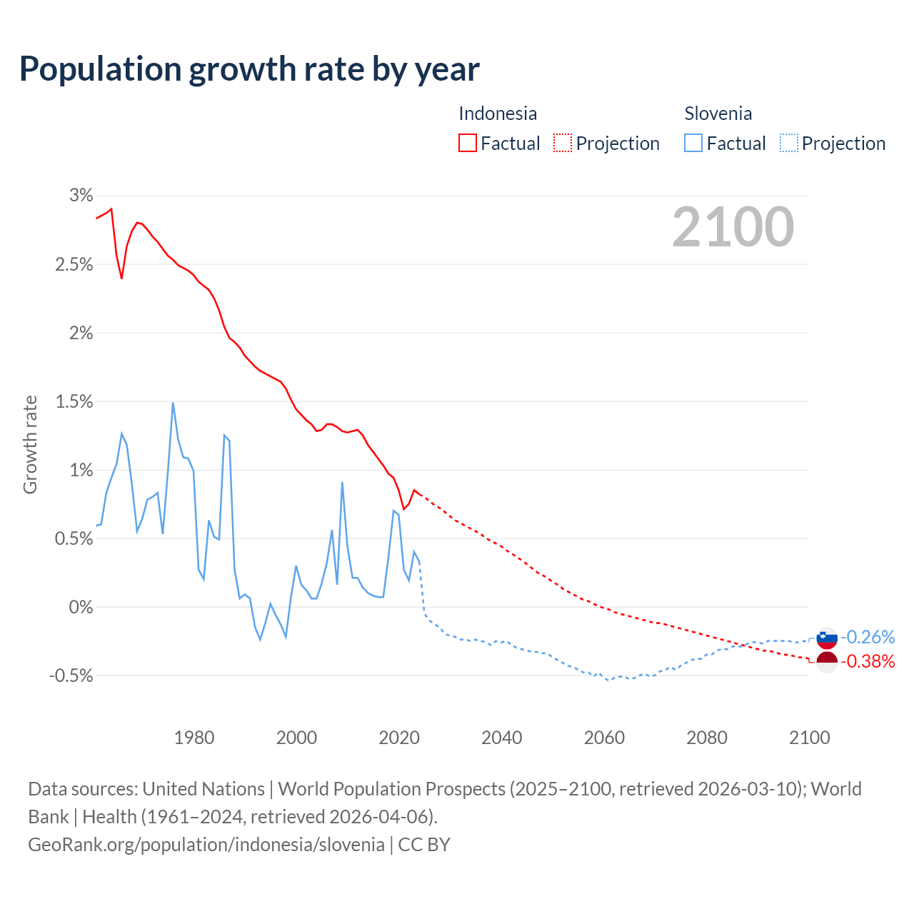 - For the last 10 years, Indonesia has had an average growth rate of +0.94% per year vs +0.29% in Slovenia.