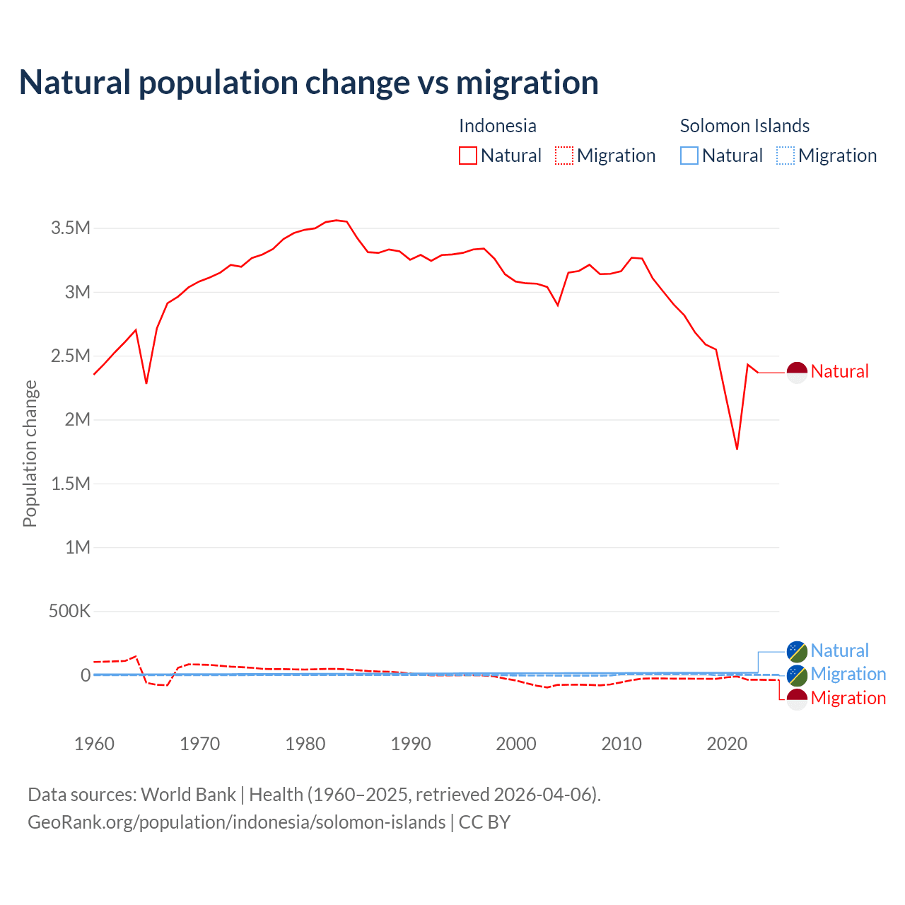 Over the last 10 years, 98.9% of the population change in Indonesia is from natural causes (a gain of 25,242,860 people) and 1.1% is from migration (a loss of 280,258 people). In the Solomon Islands 82.8% is from natural causes (a gain of 168,727 people) and 17.2% is from migration (a gain of 35,031 people).