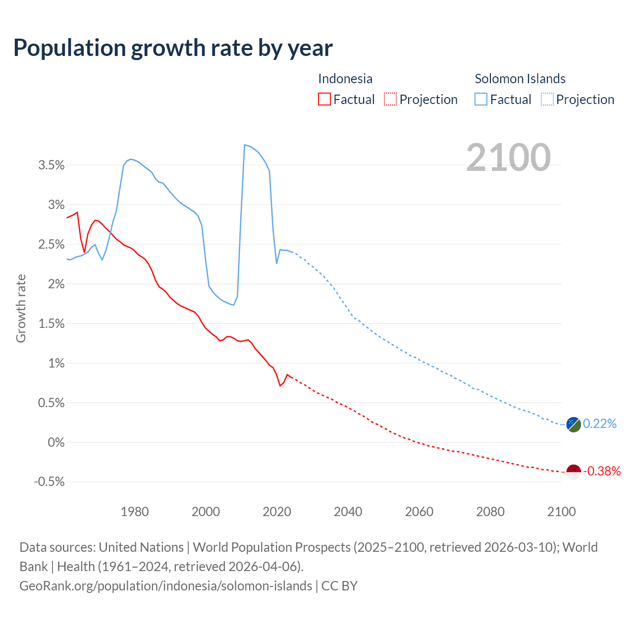 - For the last 10 years, Indonesia has had an average growth rate of +0.94% per year vs +2.95% in the Solomon Islands.