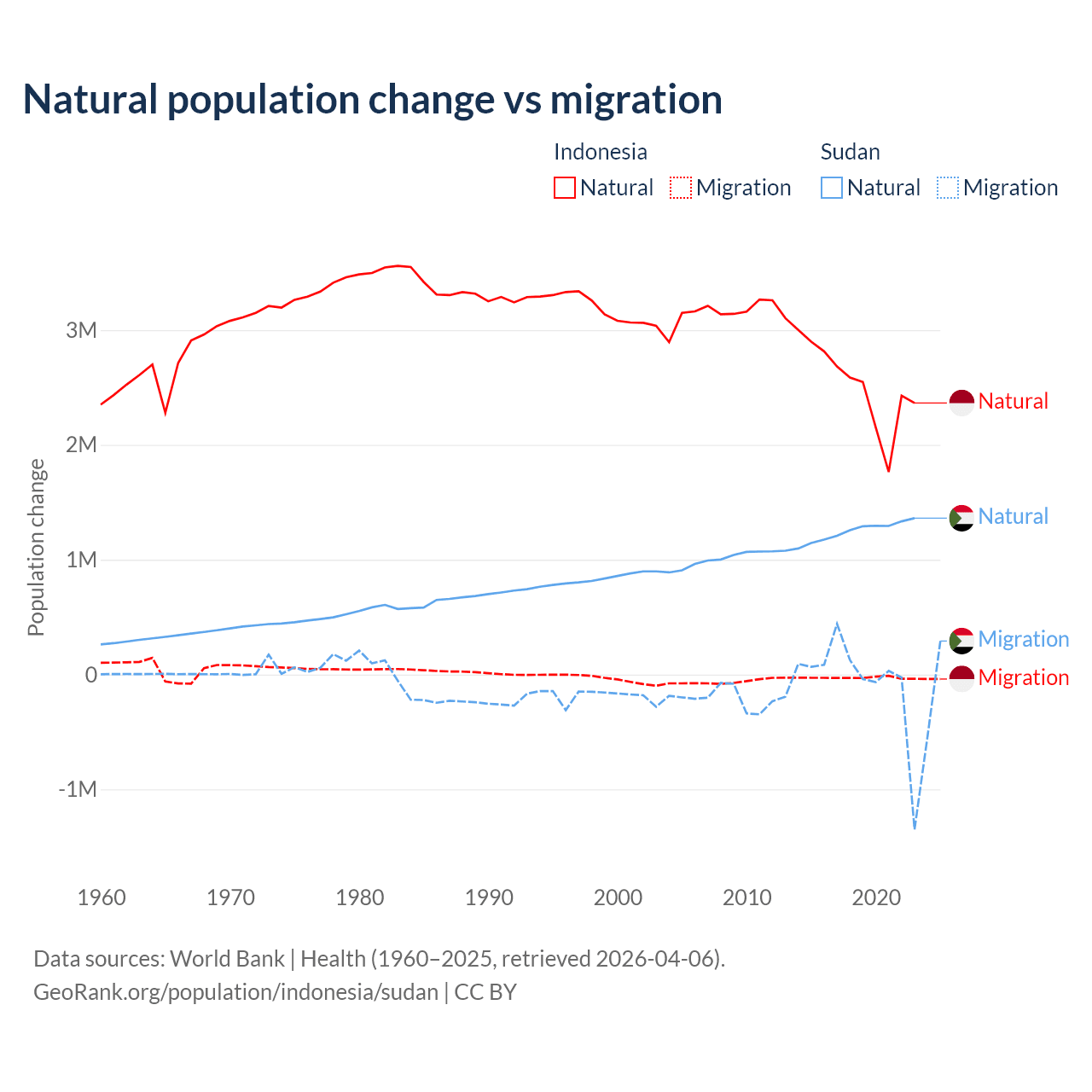 Over the last 10 years, 98.9% of the population change in Indonesia is from natural causes (a gain of 25,242,860 people) and 1.1% is from migration (a loss of 280,258 people). In Sudan 95.1% is from natural causes (a gain of 12,459,977 people) and 4.88% is from migration (a loss of 639,596 people).