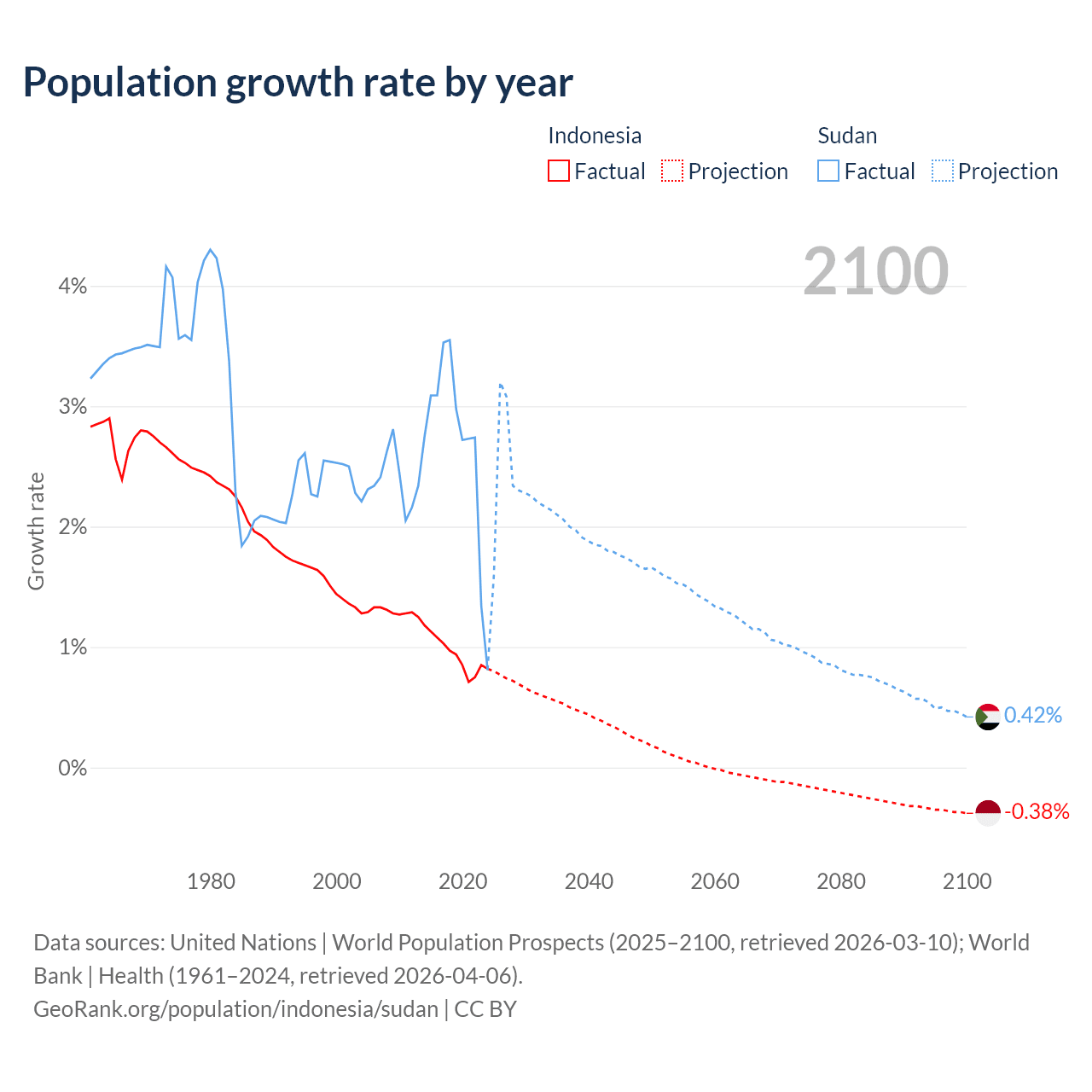- For the last 10 years, Indonesia has had an average growth rate of +0.94% per year vs +2.67% in Sudan.