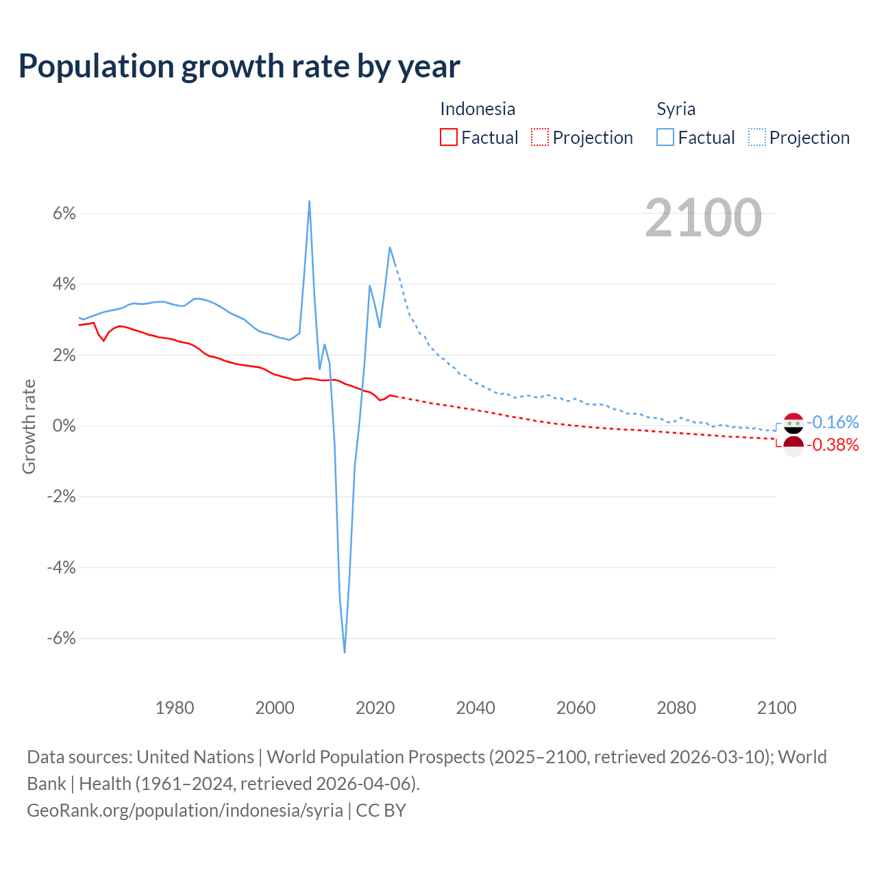 - For the last 10 years, Indonesia has had an average growth rate of +0.94% per year vs +1.25% in Syria.