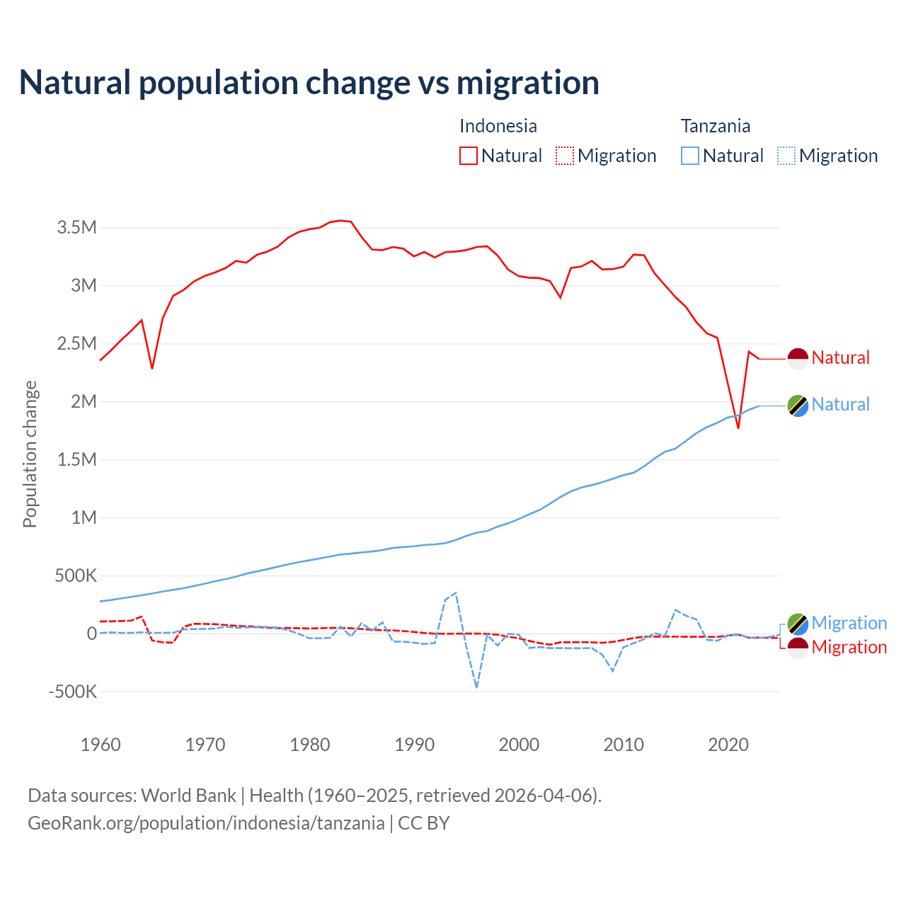 Over the last 10 years, 98.9% of the population change in Indonesia is from natural causes (a gain of 25,242,860 people) and 1.1% is from migration (a loss of 280,258 people). In Tanzania 98.7% is from natural causes (a gain of 17,769,541 people) and 1.27% is from migration (a gain of 229,466 people).