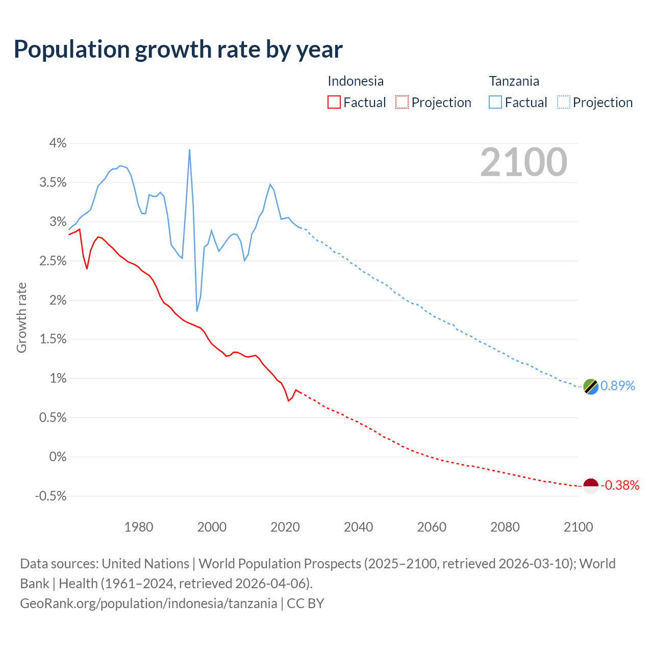 - For the last 10 years, Indonesia has had an average growth rate of +0.94% per year vs +3.13% in Tanzania.