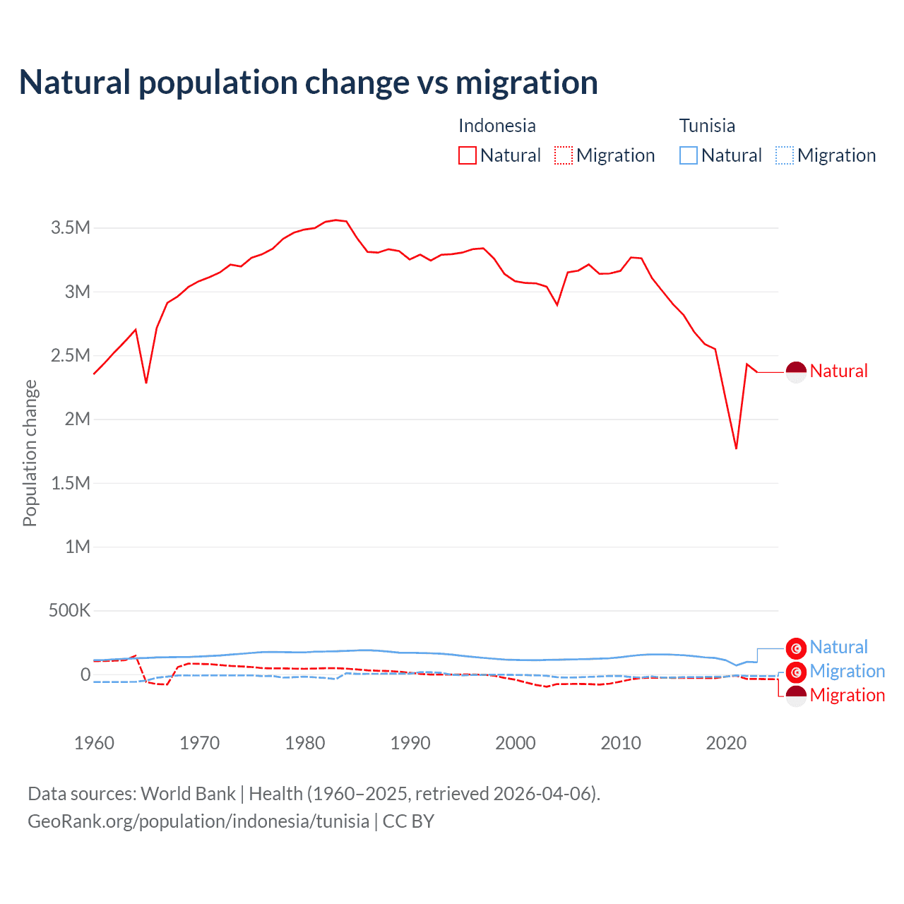 Over the last 10 years, 98.9% of the population change in Indonesia is from natural causes (a gain of 25,242,860 people) and 1.1% is from migration (a loss of 280,258 people). In Tunisia 86.3% is from natural causes (a gain of 1,225,079 people) and 13.7% is from migration (a loss of 195,011 people).