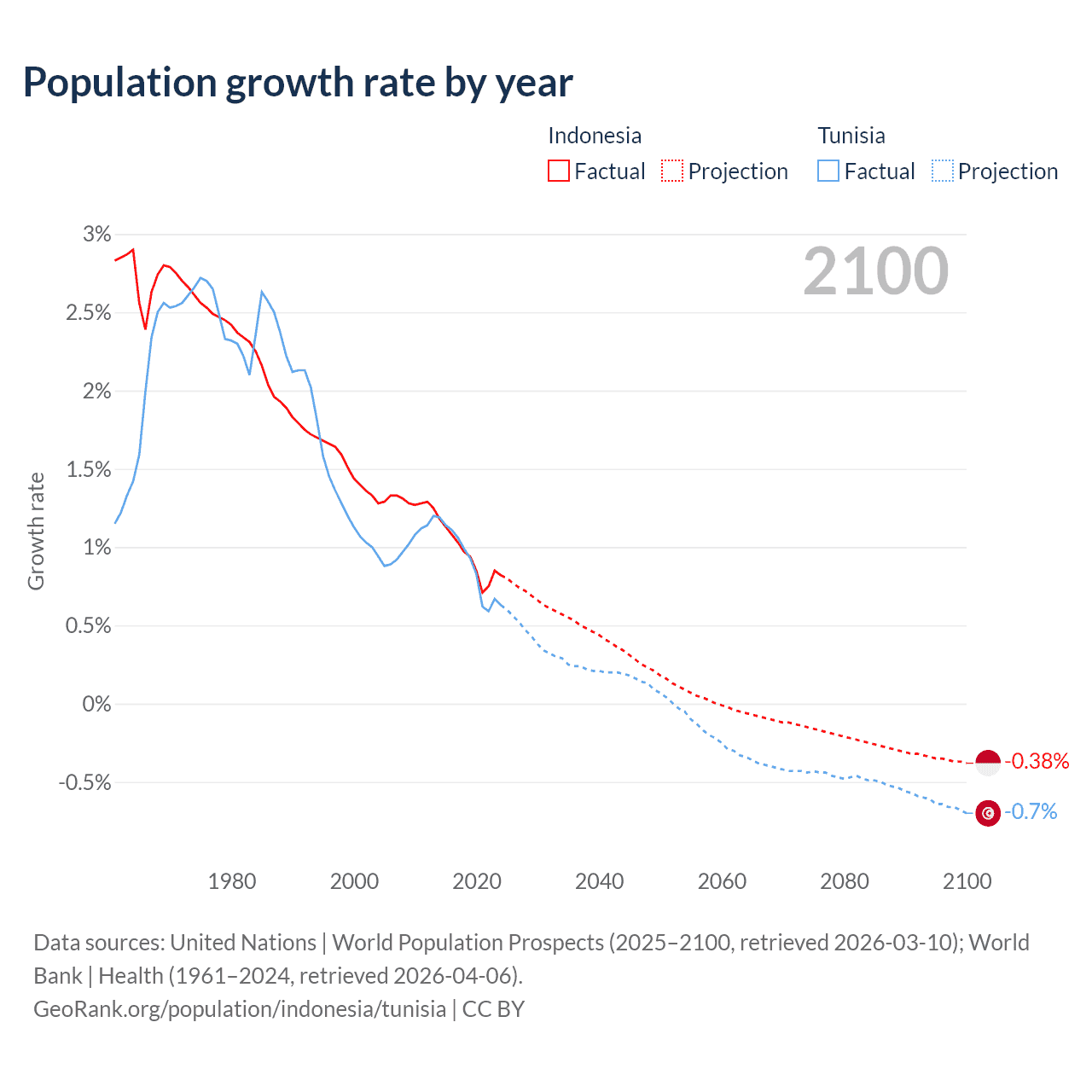 - For the last 10 years, Indonesia has had an average growth rate of +0.94% per year vs +0.89% in Tunisia.