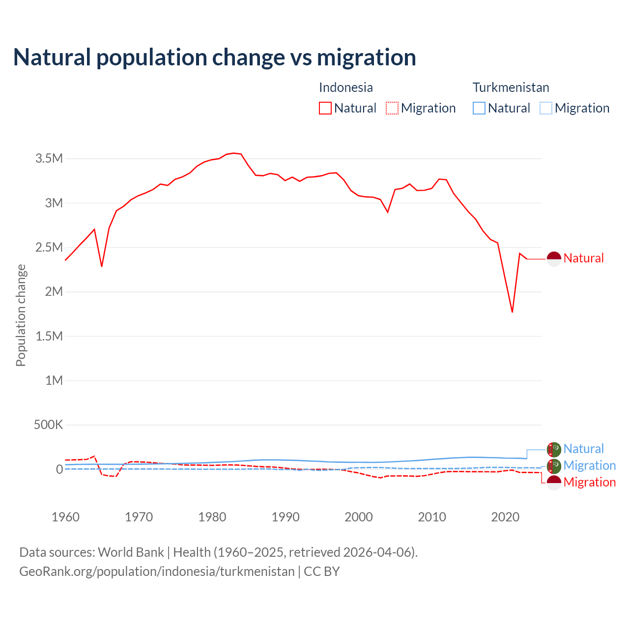 Over the last 10 years, 98.9% of the population change in Indonesia is from natural causes (a gain of 25,242,860 people) and 1.1% is from migration (a loss of 280,258 people). In Turkmenistan 89.2% is from natural causes (a gain of 1,270,228 people) and 10.8% is from migration (a gain of 154,379 people).
