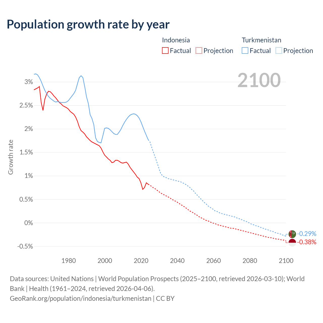 - For the last 10 years, Indonesia has had an average growth rate of +0.94% per year vs +2.14% in Turkmenistan.