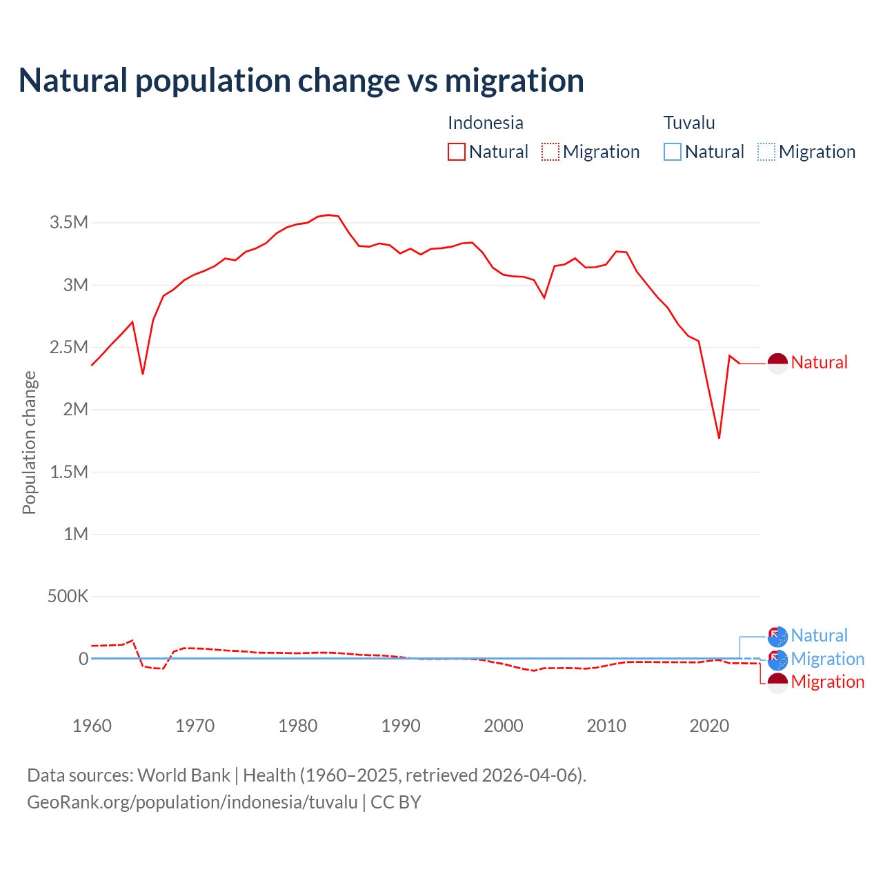 Over the last 10 years, 98.9% of the population change in Indonesia is from natural causes (a gain of 25,242,860 people) and 1.1% is from migration (a loss of 280,258 people). In Tuvalu 35.5% is from natural causes (a gain of 1,556 people) and 64.5% is from migration (a loss of 2,827 people).