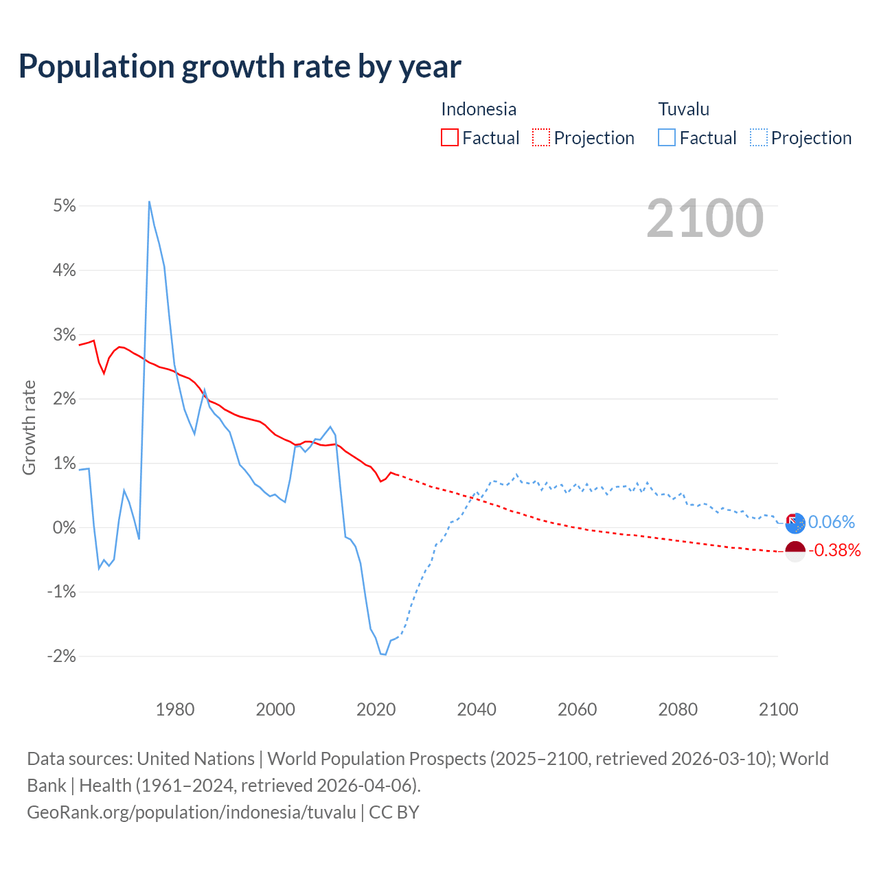 - For the last 10 years, Indonesia has had an average growth rate of +0.94% per year vs -1.19% in Tuvalu.