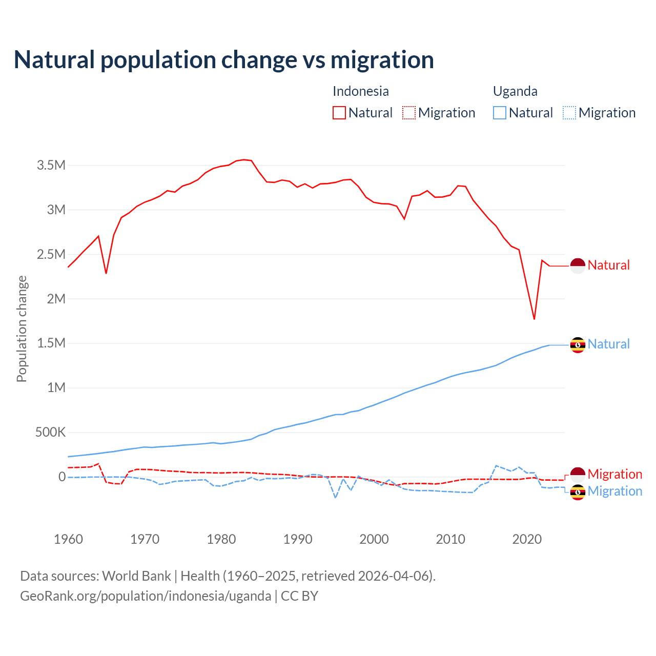 Over the last 10 years, 98.9% of the population change in Indonesia is from natural causes (a gain of 25,242,860 people) and 1.1% is from migration (a loss of 280,258 people). In Uganda 99.5% is from natural causes (a gain of 13,419,712 people) and 0.53% is from migration (a gain of 71,457 people).