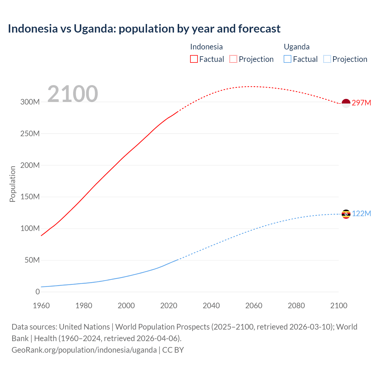 The latest officially reported population of Indonesia was 283,487,931 in 2024 vs 50,015,092 people in Uganda in 2024. In 2026, based on the adjusted UN estimation, the current Indonesia's population is 288,551,776 people compared to 53,170,946 in Uganda.