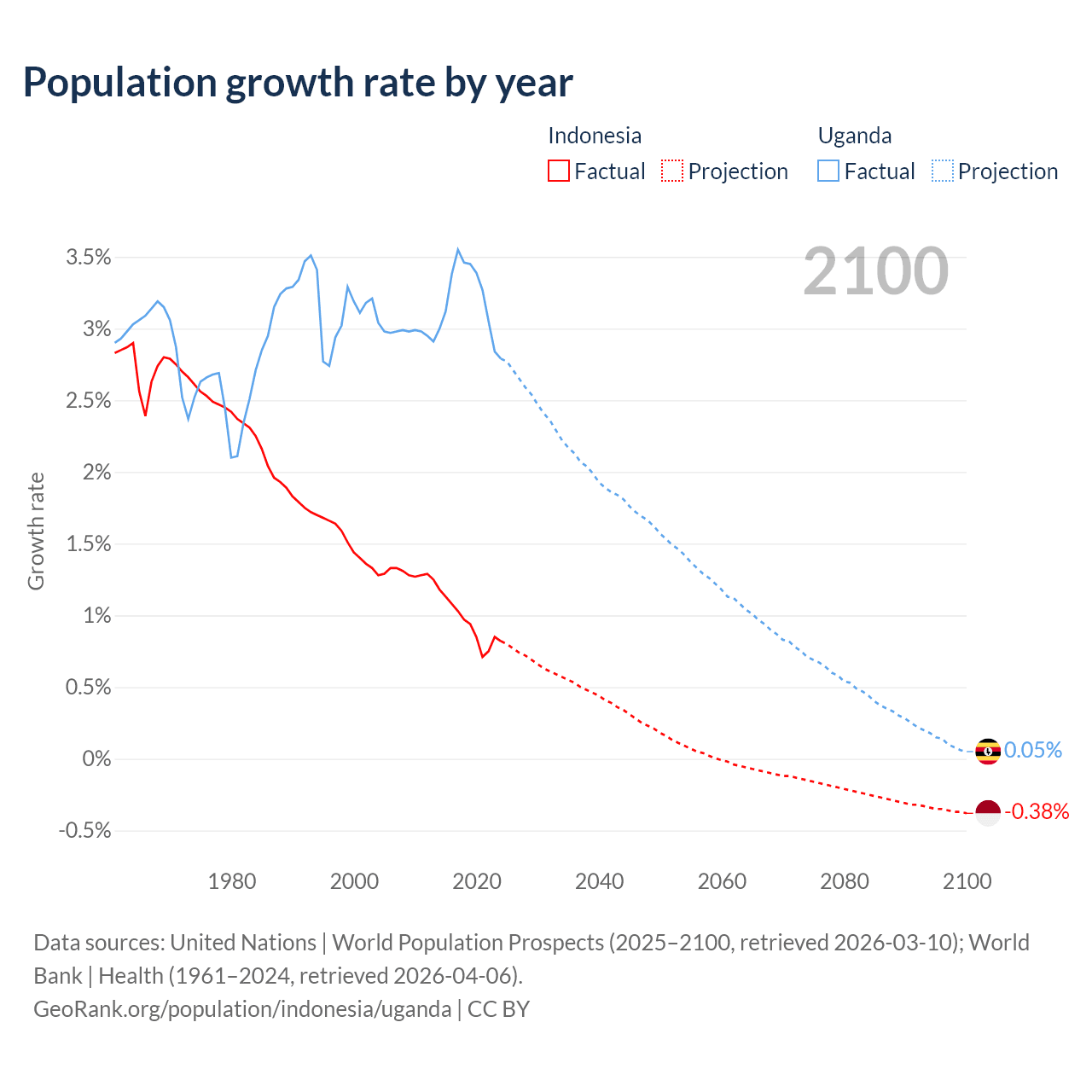 - For the last 10 years, Indonesia has had an average growth rate of +0.94% per year vs +3.21% in Uganda.