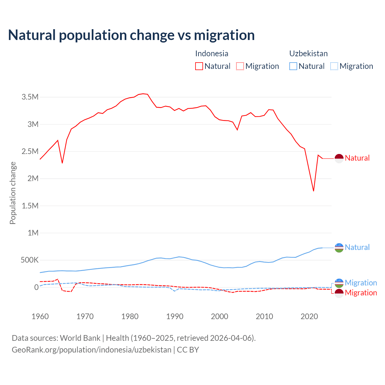 Over the last 10 years, 98.9% of the population change in Indonesia is from natural causes (a gain of 25,242,860 people) and 1.1% is from migration (a loss of 280,258 people). In Uzbekistan 98.2% is from natural causes (a gain of 6,161,117 people) and 1.84% is from migration (a loss of 115,398 people).
