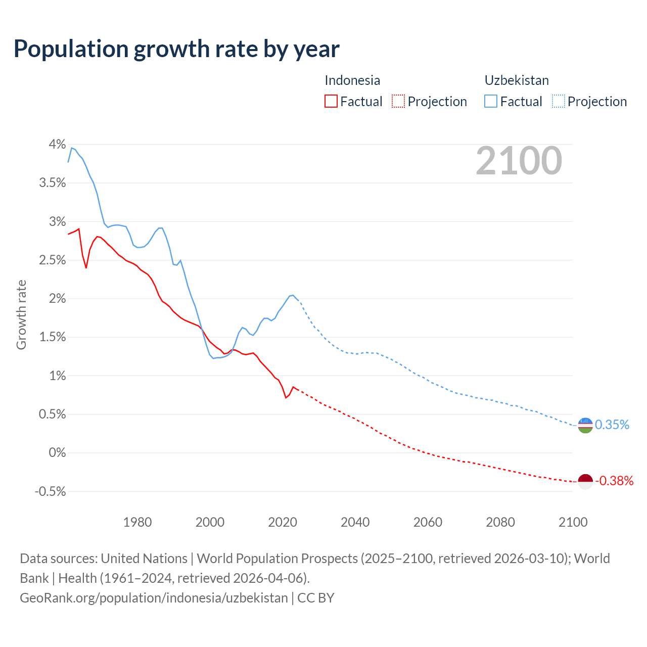 Data sources: World Bank | Health (1960–2024, retrieved 2026-04-06); United Nations | World Population Prospects (1960–2026, retrieved 2026-03-10); U.S. Census Bureau (1960–2025, retrieved 2026-02-08); Central Intelligence Agency (CIA) (2000–2019, retrieved 2026-02-20).