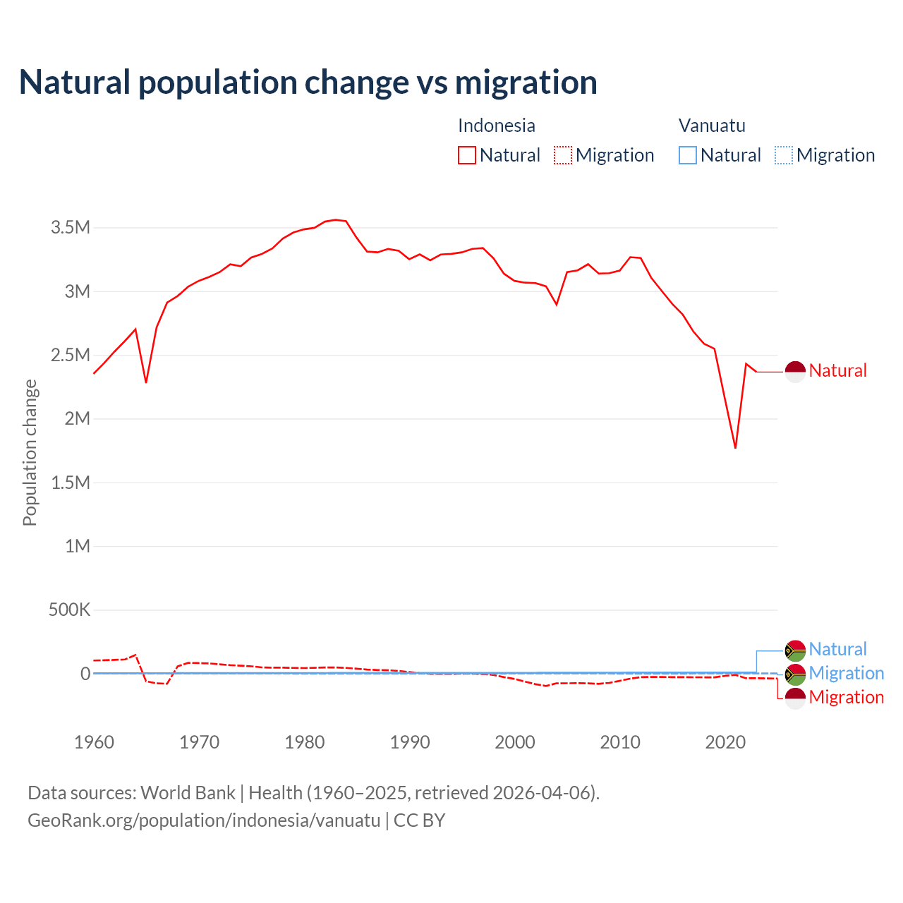 Over the last 10 years, 98.9% of the population change in Indonesia is from natural causes (a gain of 25,242,860 people) and 1.1% is from migration (a loss of 280,258 people). In Vanuatu 92.2% is from natural causes (a gain of 72,941 people) and 7.81% is from migration (a loss of 6,181 people).