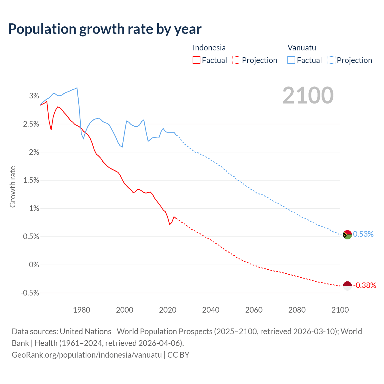 - For the last 10 years, Indonesia has had an average growth rate of +0.94% per year vs +2.33% in Vanuatu.