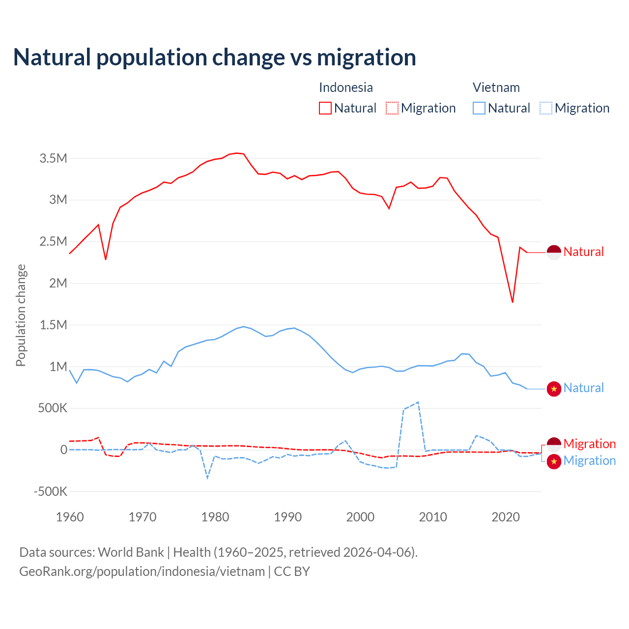 Over the last 10 years, 98.9% of the population change in Indonesia is from natural causes (a gain of 25,242,860 people) and 1.1% is from migration (a loss of 280,258 people). In Vietnam 97.7% is from natural causes (a gain of 9,349,756 people) and 2.29% is from migration (a gain of 219,073 people).