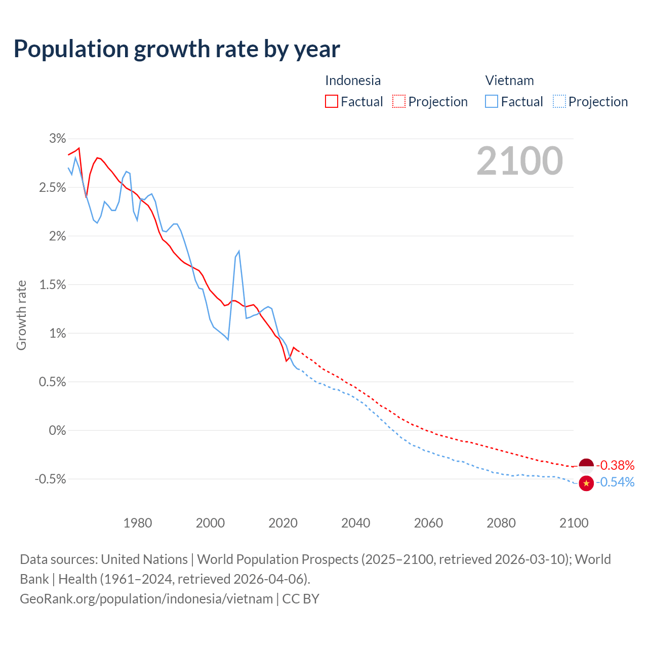Data sources: World Bank | Health (1960–2024, retrieved 2026-04-06); United Nations | World Population Prospects (1960–2026, retrieved 2026-03-10); U.S. Census Bureau (1960–2025, retrieved 2026-02-08); Central Intelligence Agency (CIA) (2000–2019, retrieved 2026-02-20).