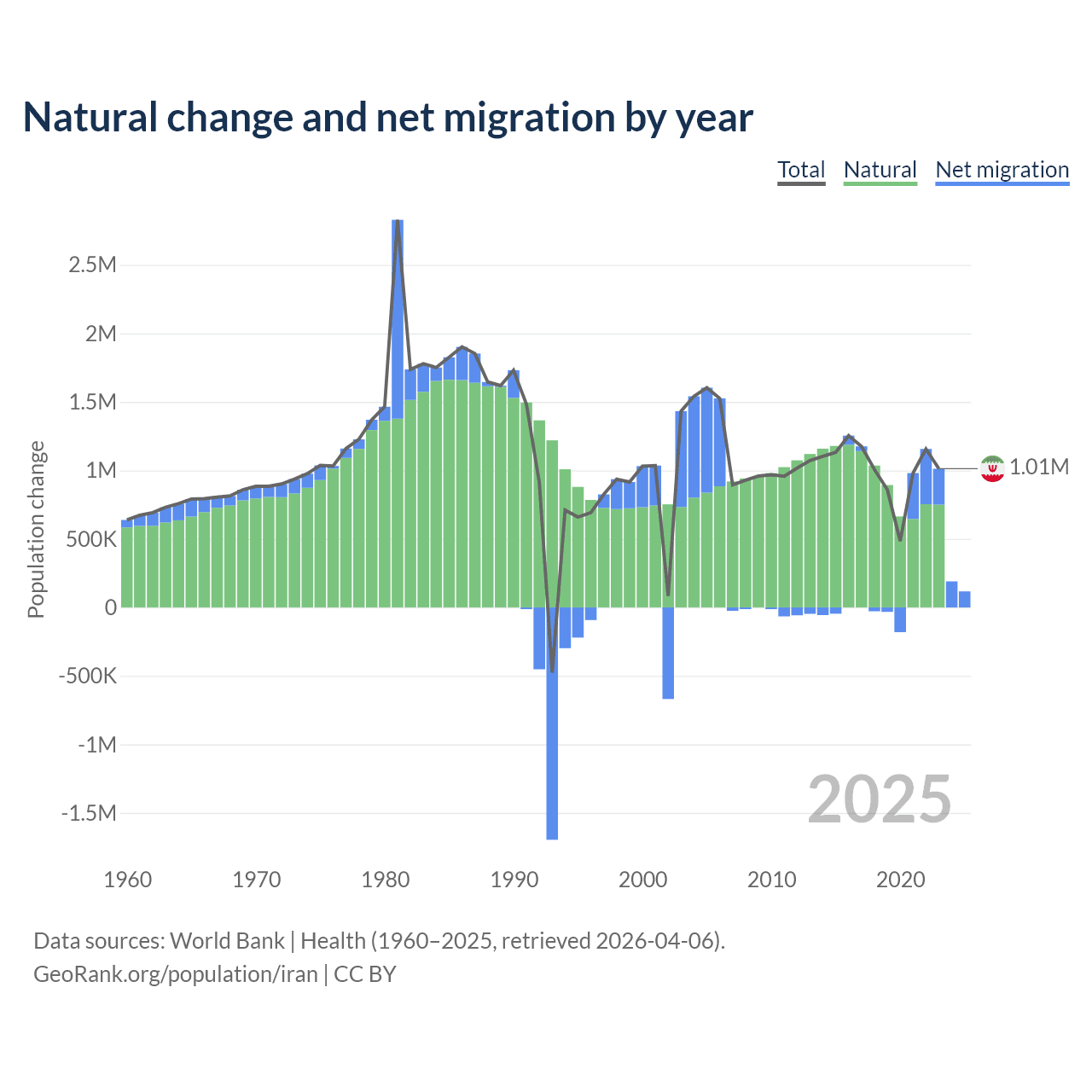 Over the last 10 years, 92.5% of the population change in Iran is from natural causes (a gain of 9,405,860 people) and 7.46% is from migration (a gain of 757,979 people).