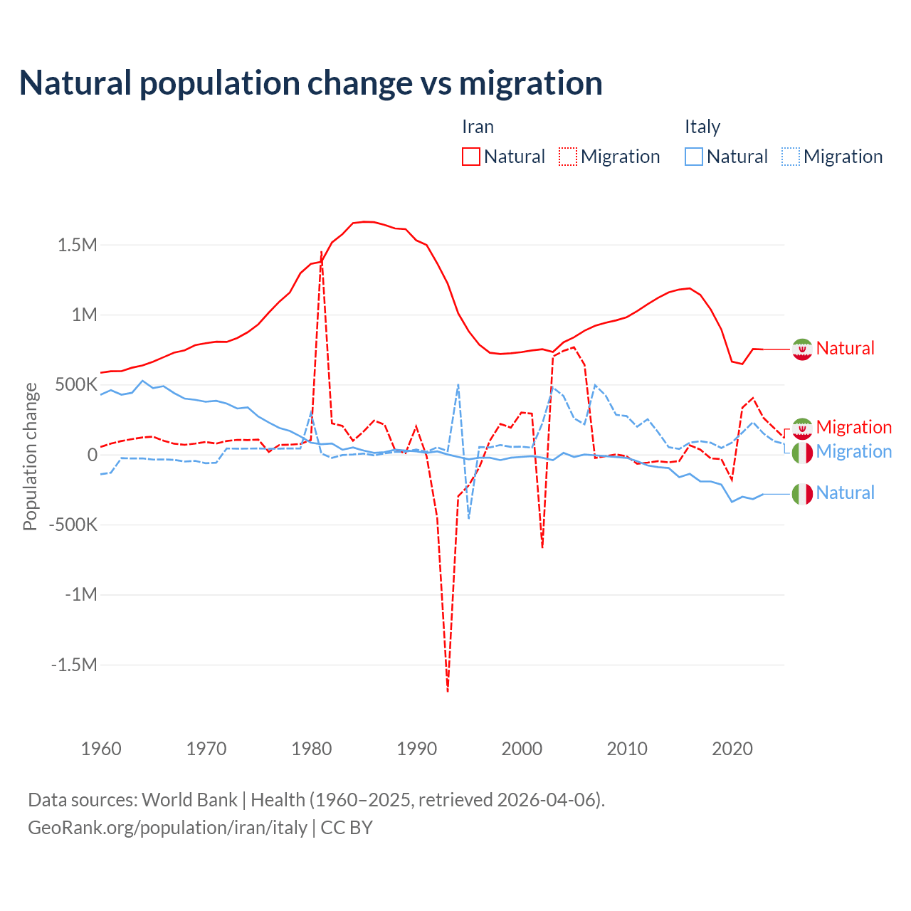 Over the last 10 years, 92.5% of the population change in Iran is from natural causes (a gain of 9,405,860 people) and 7.46% is from migration (a gain of 757,979 people). In Italy 68.6% is from natural causes (a loss of 2,239,084 people) and 31.4% is from migration (a gain of 1,026,128 people).