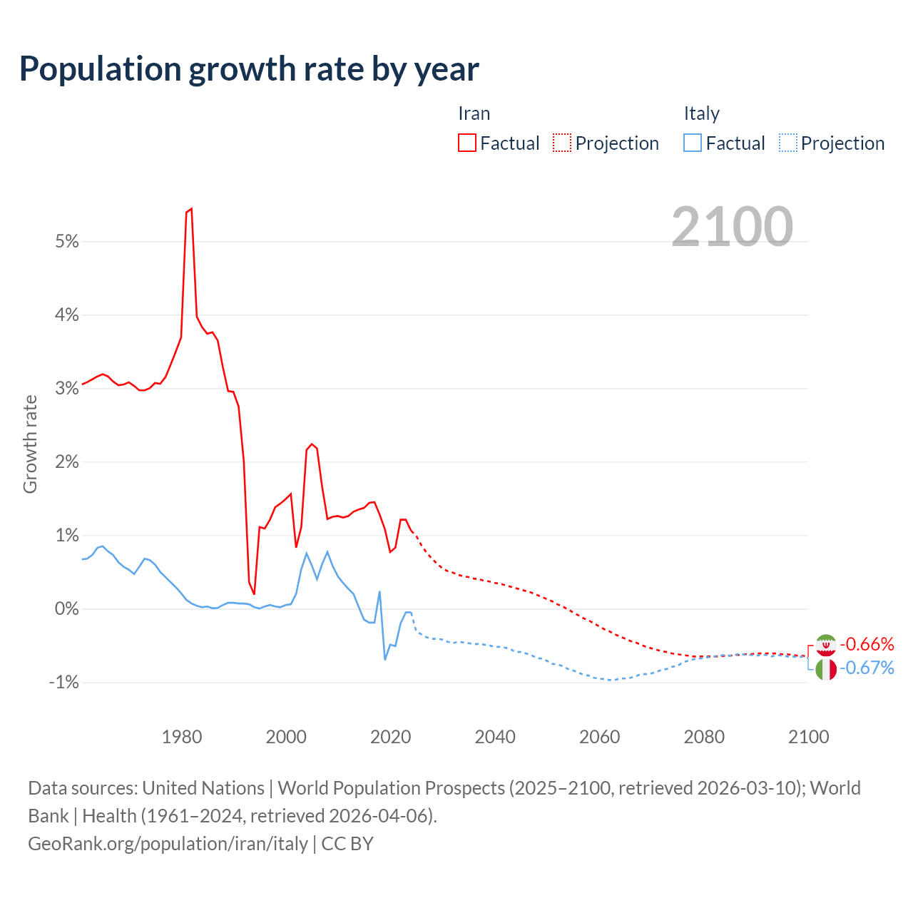- For the last 10 years, Iran has had an average growth rate of +1.19% per year vs -0.21% in Italy.