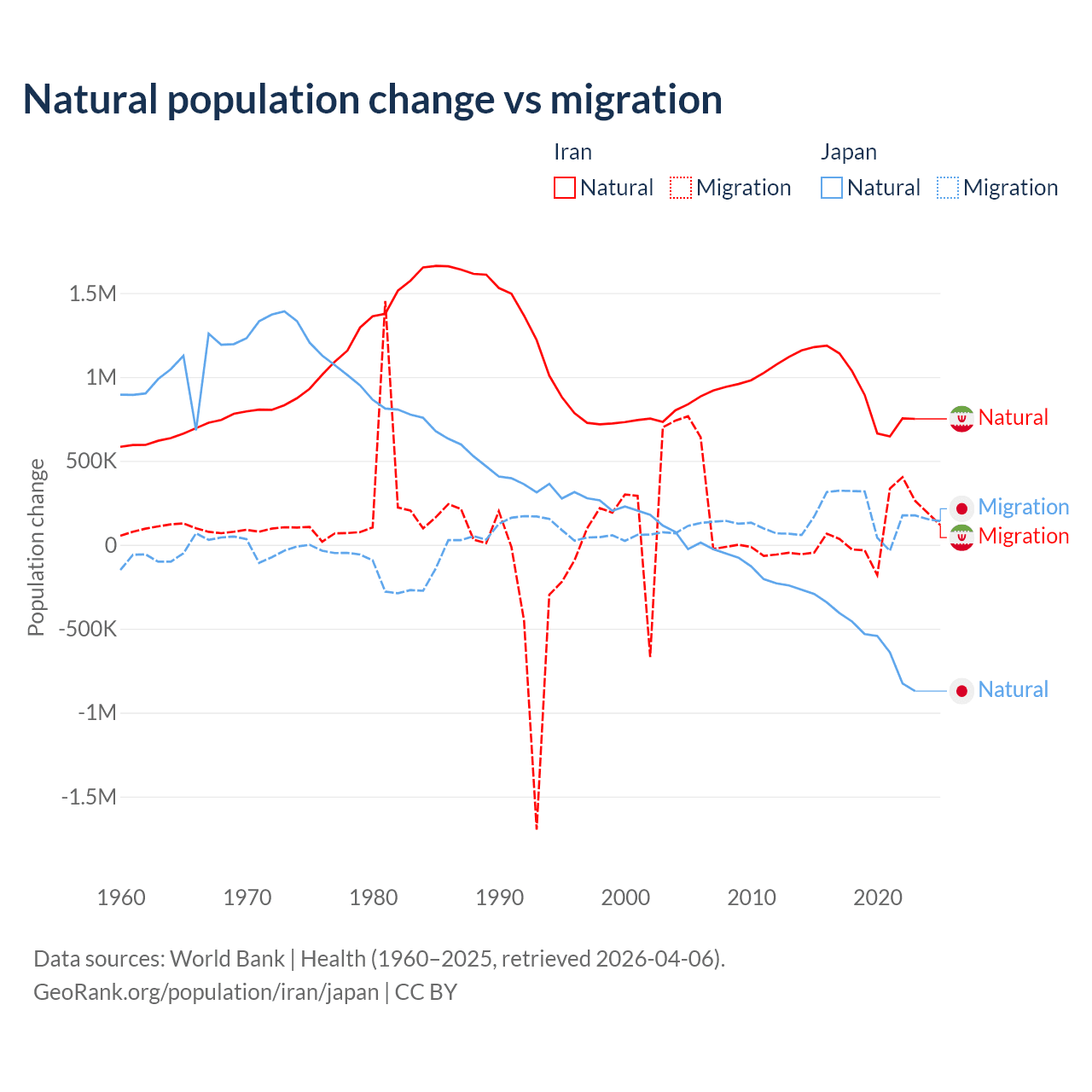 Over the last 10 years, 92.5% of the population change in Iran is from natural causes (a gain of 9,405,860 people) and 7.46% is from migration (a gain of 757,979 people). In Japan 73.6% is from natural causes (a loss of 5,178,838 people) and 26.4% is from migration (a gain of 1,860,103 people).