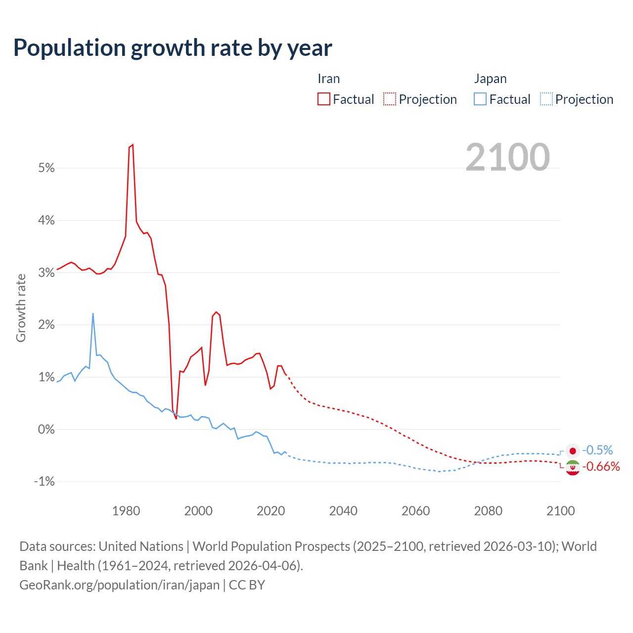 - For the last 10 years, Iran has had an average growth rate of +1.19% per year vs -0.25% in Japan.